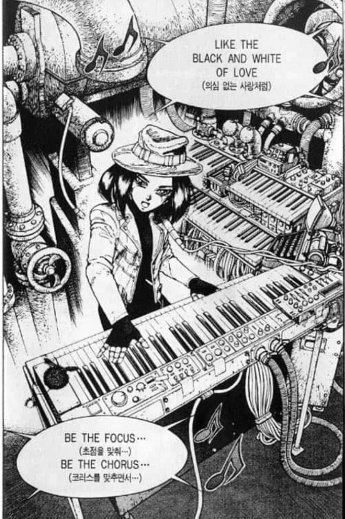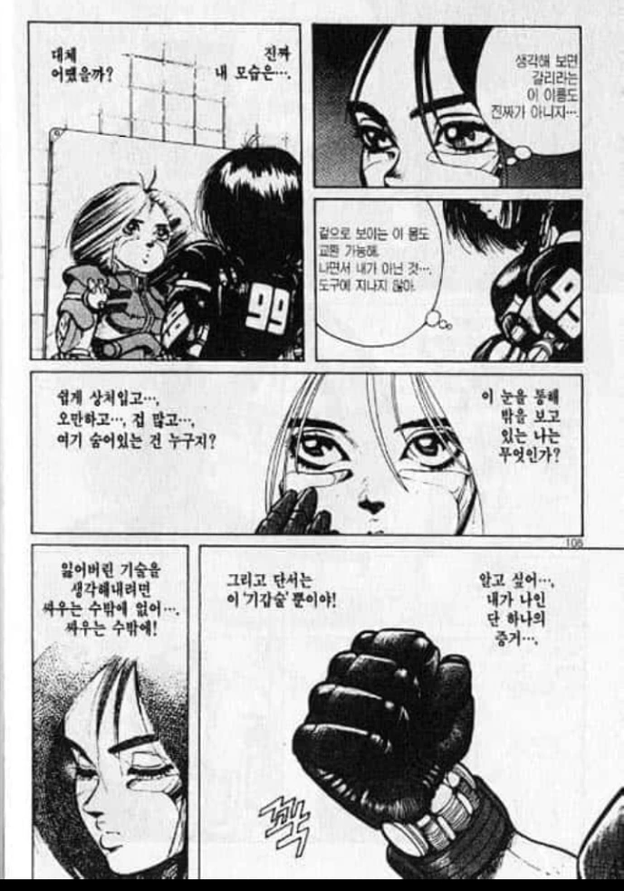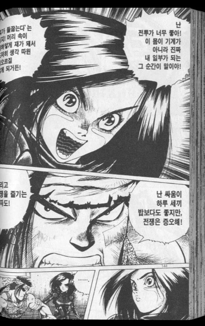 "난 전투가 너무 좋아! 이 몸이 기계가 아니라 진짜 내 일부가 되는 그 순간이 말이야! 피가 들끊는다는거지! 머리속이 새하얗게 재가 되서 도저히 생각따윈 떠오르질 않게 되거든"-갈리