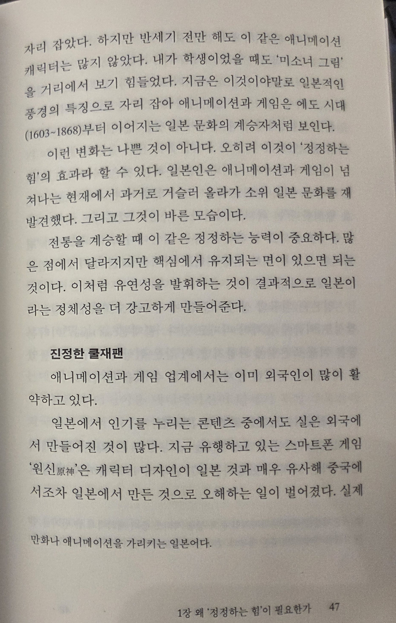 전통을 계승할 때 바로 이런 정정하는 능력이 중요하며 아는 과거를 기억하고 재해석하는 능력과도 연결되어 있다. 일본은 게임과 애니메이선이 넘쳐나는 현실에서 과거의 일본 문화를 재발견했다. 닌자나 사무라이같이 세계적으로 유명한 일본의 전통문화는 2차 대전 패전 이후 잊혀졌지만 70년대 이후 데즈카 오사무의 아톰이나 토리야마 아키라의 드래곤볼같은 만화를 비롯한 서브컬처의 부흥을 통해 재발견된 것이다.