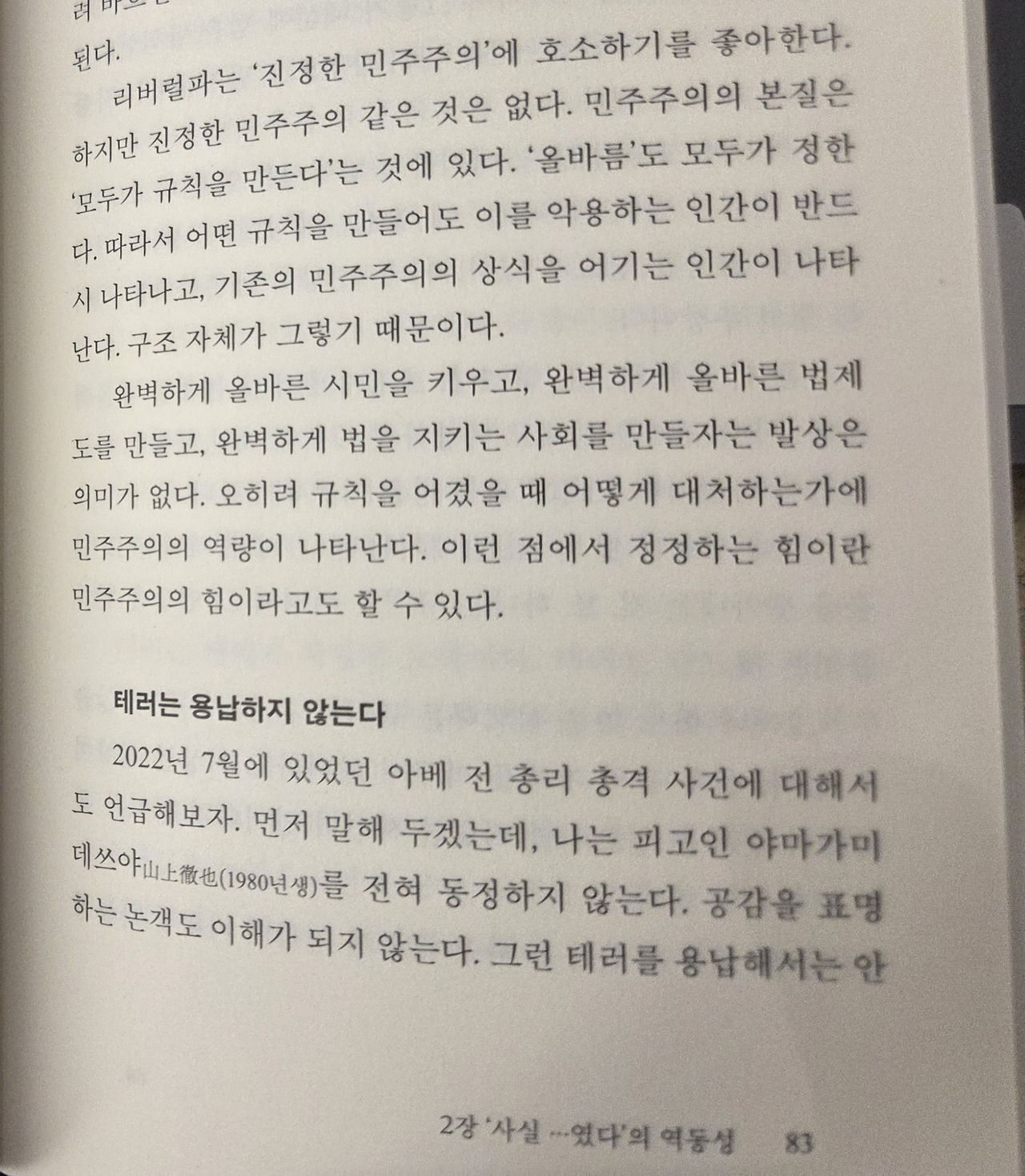완벽한 법이나 완벽한 사회나 완벽한 시민은 없다. 오히려 이런 민주주의 체제 아래에서는 반칙이나 불법이 반드시 나온다고 봐야만 한다. 이렇게 규칙을 어기거나 악용하는 사람을 어떻게 대처할 것인가 에서 민주주의의 진가가 드러난다. 이를 바로잡는 것 또한 국가의 주인인 시민들이 한 명 한 명 정정하는 힘을 발휘해야만 한다. 그래야만 화산파 전체가 전멸하는 씁쓸한 과거나, 나라 전체가 일본 제국에 굴복하고 식민지의 2등 시민으로 굴종했던 쓰라린 과거의 기억을 반복하지 않게 될 것이다...