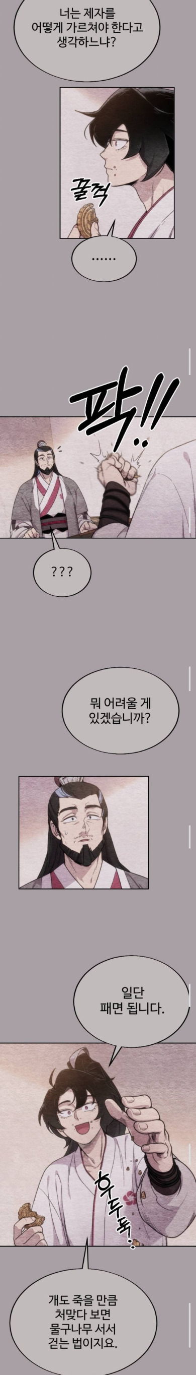 이렇게 환생해서 화산 전체를 다시 위대하게 만들려는 청명이는 전생에도 좋은 제자를 길러냈을까? 안타깝게도 화산의 매화검존이자 천하제일검이던 전생의 청명은 제자를 단 한 명도 키우지 못했다. 이는 명백히 매화검존 자신의 책임이다. 전생의 그는 흔한 오만한 무인처럼 그저 홀로 강해지고 자신의 무공을 천하에 과시하고 싶었기에, 제자 따위는 시간낭비 거나 맘대로 때려서 멋대로 부릴 수 있는 노예 정도로만 생각했으니 이런 그에게 제대로 제자가 생길 수가 없었다. 그 이유만은 아니겠지만 그래서 백 년 뒤 화산엔 천하제일검이던 자신의 무공을 전수한 제자가 단 한 명도 없었던 것.