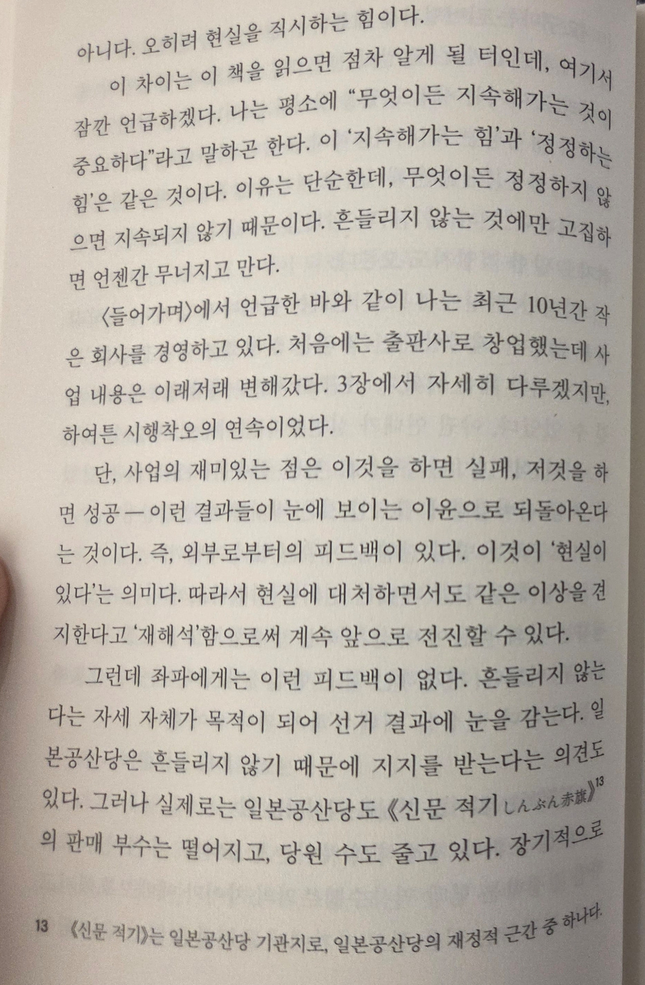허나 일본 공산당같은 좌파에겐 이런 피드백이 없다. 흔들리지 않기 때문에 지지를 받는다는 의견도 있지만 객관적으로 일본 공산당은 당원 숫자가 매년 줄어들고 있다는 게 객관적 진실이다. 물론 자민당같은 일본 보수 우파들도 쿨 재팬이니 뭐니 개혁을 말하지만 집권 수십년째 아무것도 바꾸려 하지 않는다는 건 두말하면 그저 잔소리일 뿐이다. 이런 일본의 변화를 거부하고 과거를 고집하는 좌파 우파 이야기 또한 그저 옆집만의 이야기는 아닐 것이다.