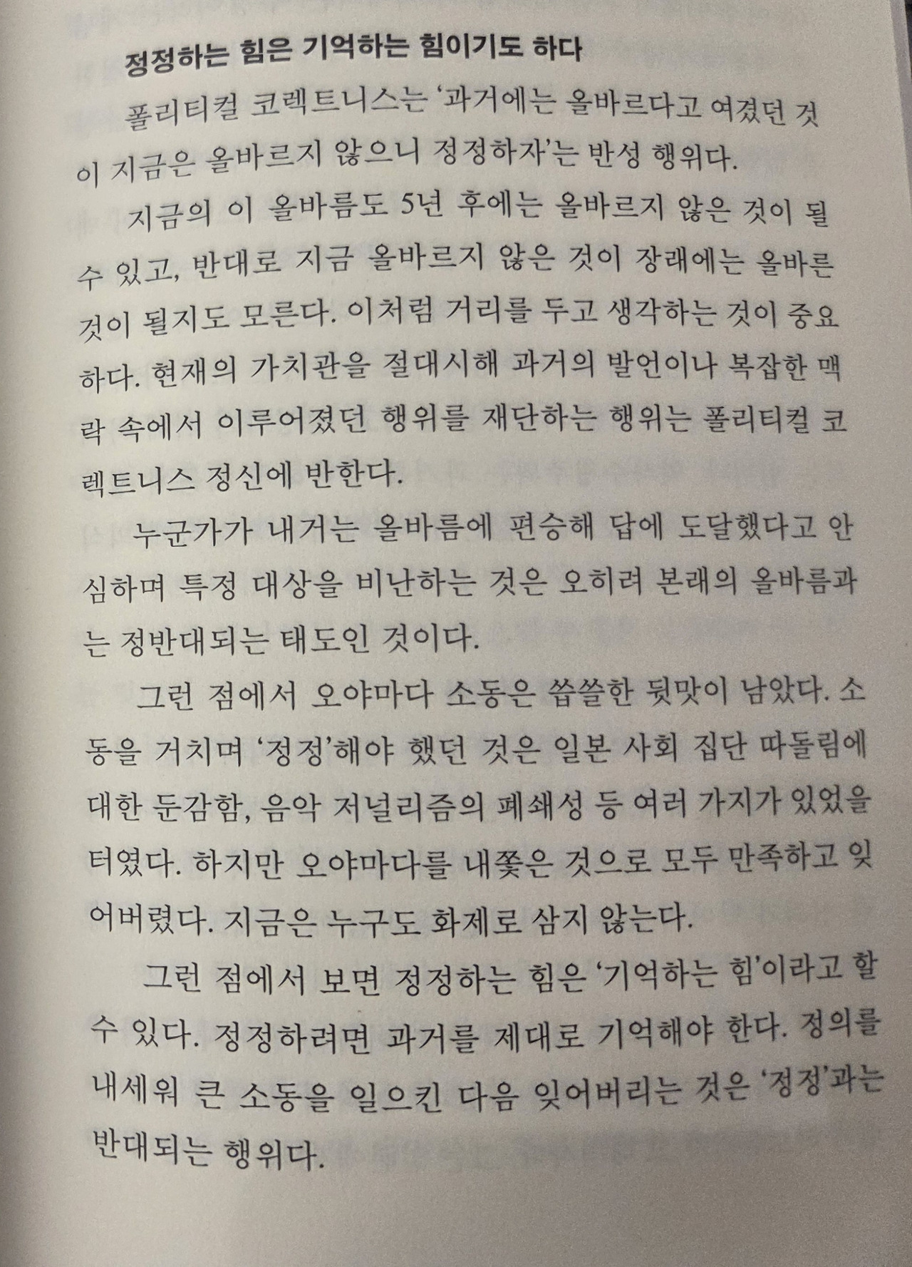 또한 이런 기억하는 힘은 정치적 올바름PC, political correctness라고 불리는 21세기의 큰 사상적 조류와도 연결지어 생각해 볼 만하다. 소수자에 대한 차별에 반대한다는 최근의 이 PC에 대한 염증, 거부감은 왜 세계적으로 두드러지며 전체주의 파시즘에 가까운 트럼피즘을 비롯한 위험한 대안 우파세력은 왜 급증하는가?