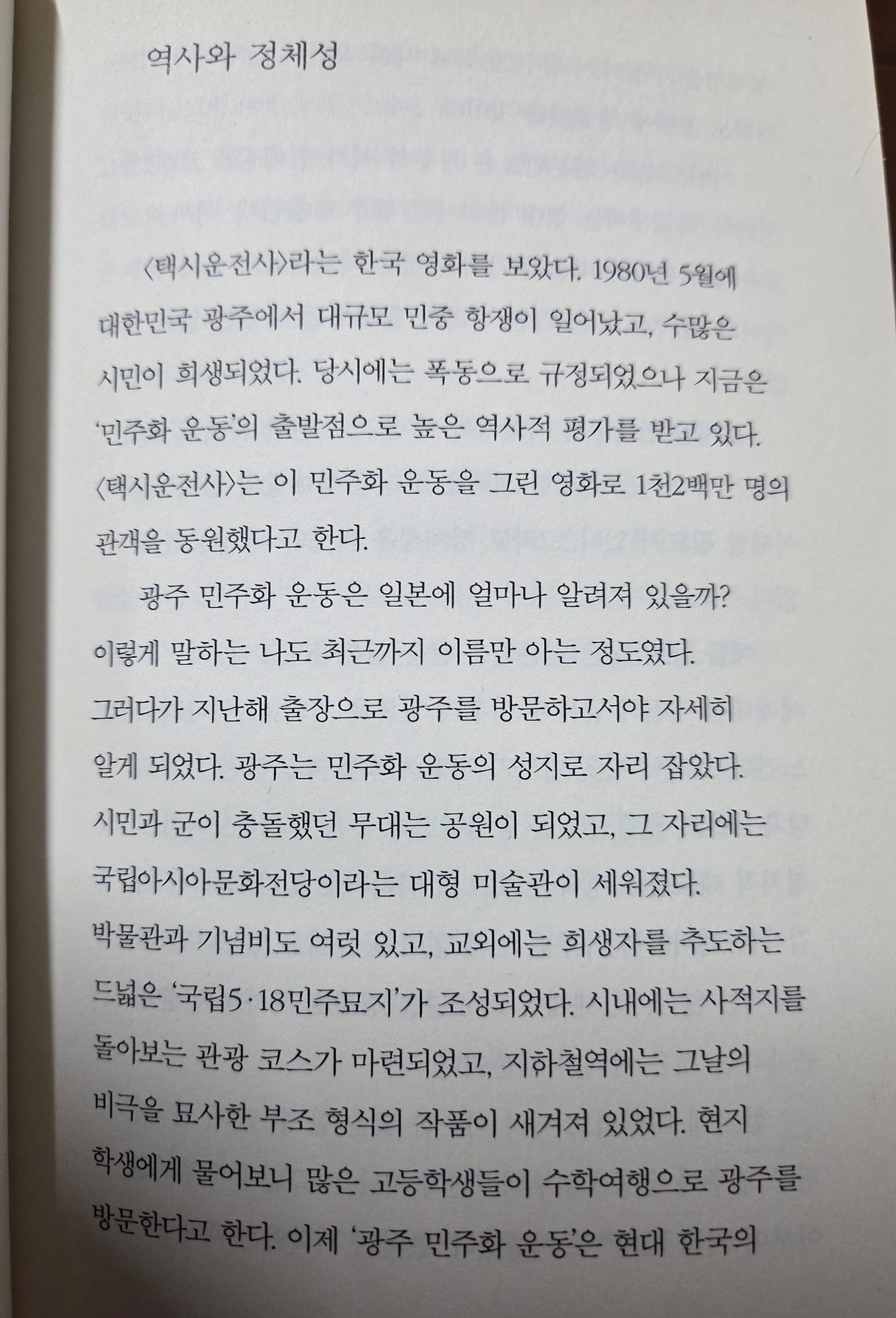 내가 일본 역사에 대해 잘 모르지만 하루키도 종종 이야기하는 68년의 전공투 세대나 아사마 산장 사건에 대해 이름은 들어봤듯이, 아즈마 아재도 80년 오월광주에 대해 이름 정도만 알다가 출장으로 광주를 방문하여 좀 더 알게 된 듯하다.