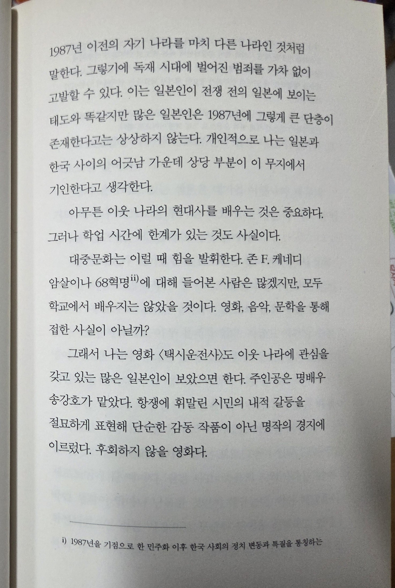 바로 옆 나라임에도 서로의 현대사에 대해 그다지 알지 못하는 건 역시 공교육의 문제가 크다. 일본이나 한국이나 이런 상대방의 역사에 대한 무지로 인해 외교나 무역을 비롯해 유무형의 손해와 쓸데없는 혐오 감정을 쌓고 있지는 않은가.