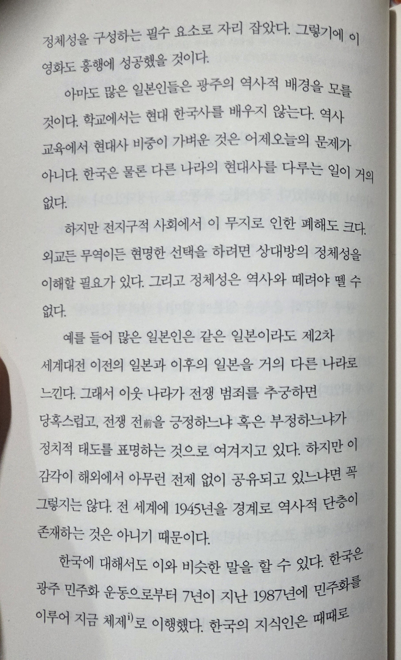 일본이 45년 패전 이후로 미국과 전쟁하다가 미국의 동맹국이 되는 등 다른 나라가 되었다고 여기듯이, 한국도 광주 민주화운동과 87년 직선제 개헌과 민주화투쟁 이후로 많은 부분이 군사독재 시절과는 다른 나라가 되었다고 많은 사람들이 말한다. 이 45년과 87년이라는 간격이 바로 아즈마 아재가 볼때 한일간의 어긋남을 만들어내는 무지의 거리가 아닐까 하는 말에 저절로 고개가 끄떡여진다. 32년이라는 두 세대가 넘는 시간은 개인이 혼자 공부해서 넘기에 정말 쉽지 않으니까.