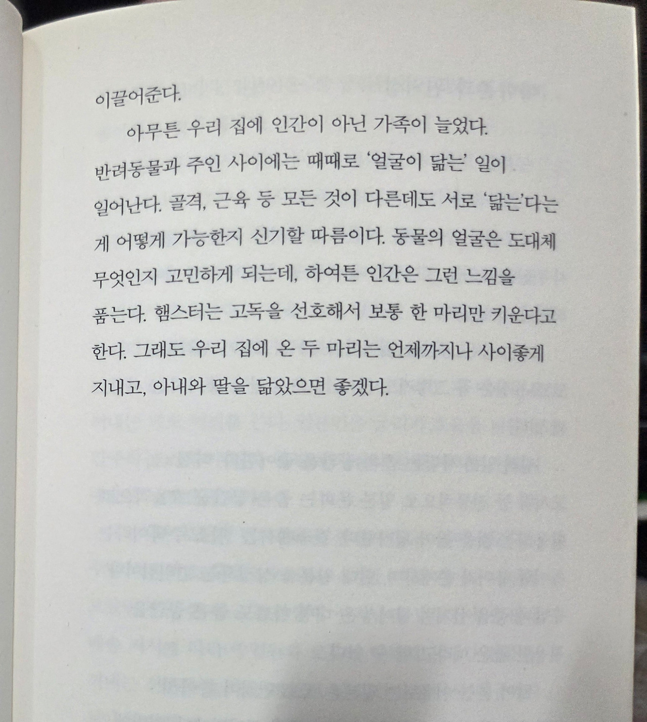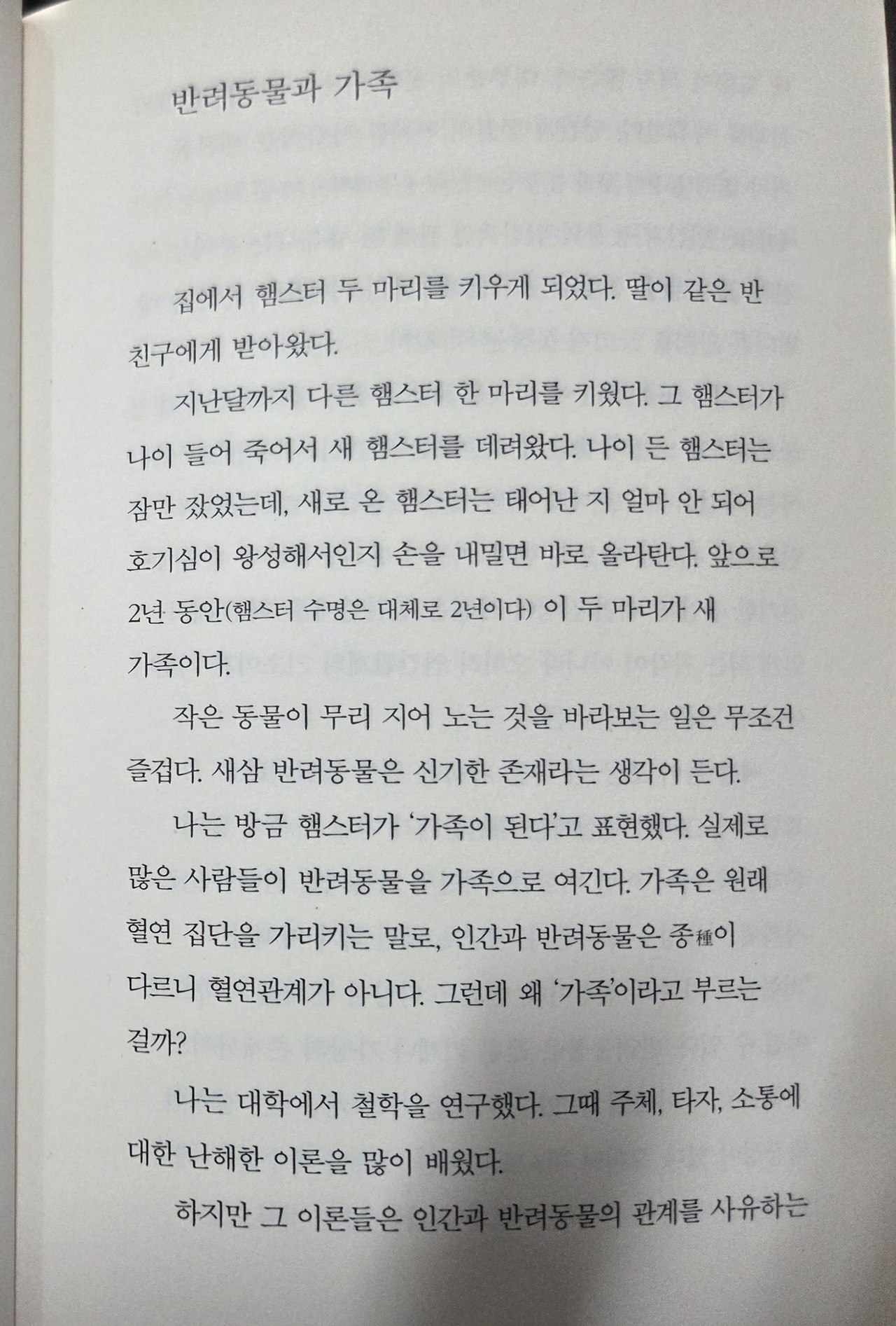 이렇듯 혈연이 아니어도 가족인 관계들은 이미 현실에 차고 넘친다. 게다가 아즈마 말대로 이렇게 같이 사는 존재들은 왠지 모르게 서로 닮아가는 듯한 느낌을 받는다. 골격도 근육도 다른데 인간과 동물은 대체 어떻게 닮는 게 가능한가? 물론 그것은 대단히 주관적인, 어쩌면 인간 중심주의적인 편향적인 오해와 착각에 불과할 것이다. 그럼에도 어쩌면 그런 오해, 오배송에 가까운 일방적인 인간의 시선과 편향적인 주관이 선사시대처럼 동물을 낯설고 두려운 타자로 여기는 게 아니라 인간의 친구와 가족으로 만들어주는 건 아닐까? 어쩌면 바로 그런 가능성이 3장이라는 지면 관계상 다 말하지 못한 아즈마의 다른 주저인 관광객의 철학이나 정정 가능성의 철학 등에서 일관되게 말하는 우편적인 오배의 철학일지도.