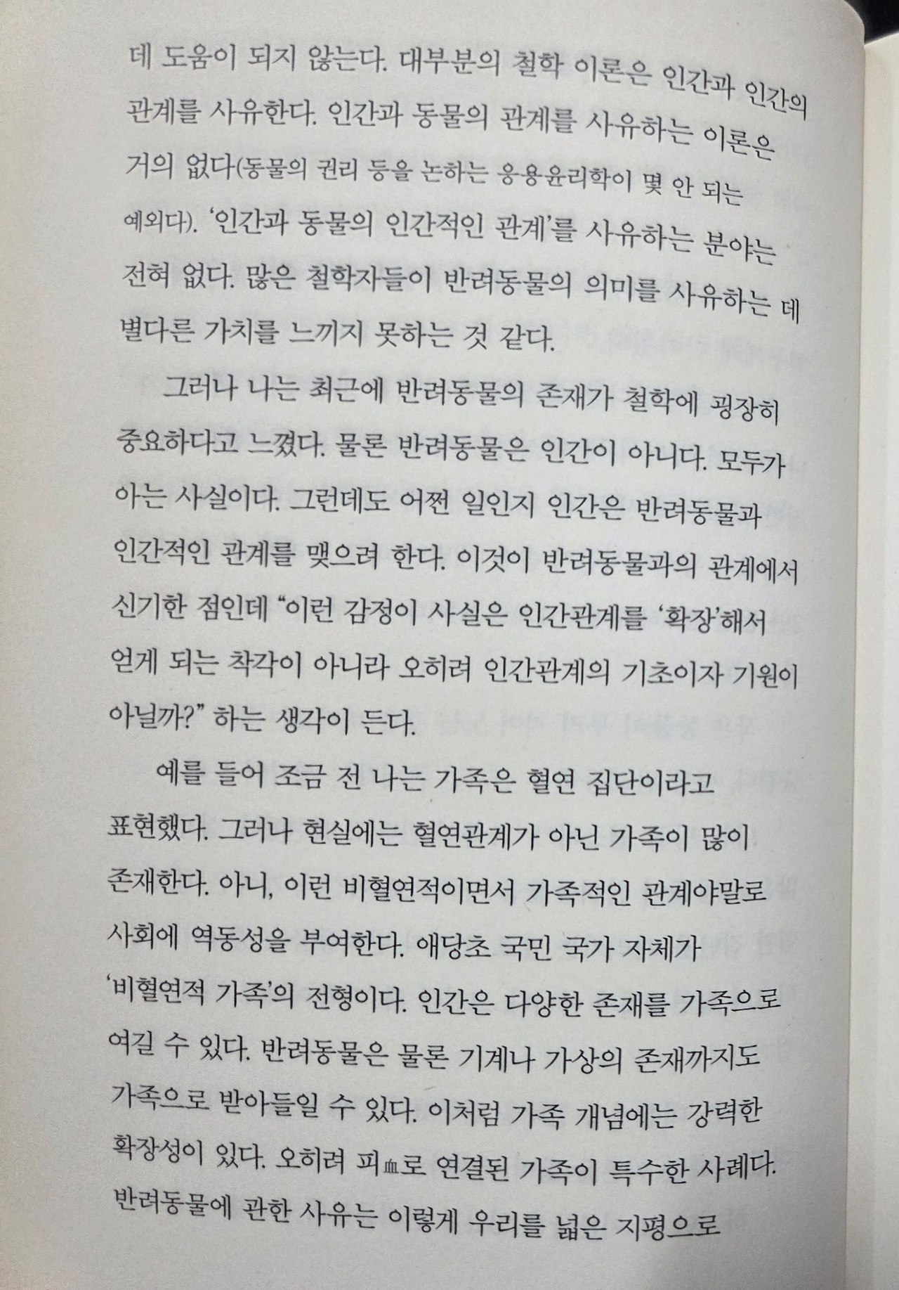 데리다를 전공한 아즈마를 비롯해서 수천년 서양 철학의 전통은 인간과 인간의 관계만을 다루어왔다. 응용윤리학의 피터 싱어 정도만이 동물권을 주장하는 한 줌의 철학 분파다. 그렇지만 일본도 그렇고 한국도 반려동물 천만을 넘어가는 시대에 인간과 동물의 관계를 사유하는 것이야말로 철학자들의 중대한 과업이 아닐까?