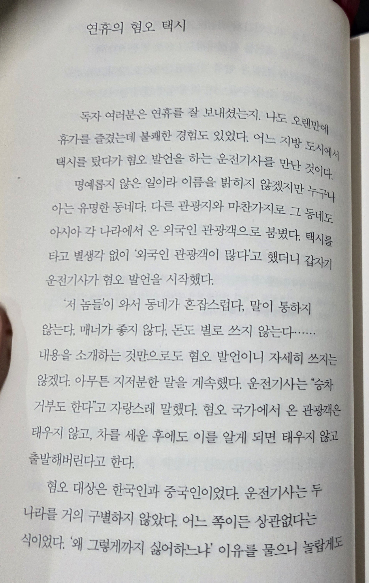'저 놈들'이 와서 동네가 혼잡스럽고 말이 안 통하고 매너가 안 좋고 돈도 별로 안 쓴다... 분명 굉장히 순화한 표현 같은데도 뭔가 굉장히 익숙한 레퍼토리의 혐오 표현들이다. 아마도 택시기사의 마지막이 핵심일 듯하다. 외국에서 관광왔으면 돈 펑펑 쓰고 자기한테 팁도 주고 그런걸 기대하려나?