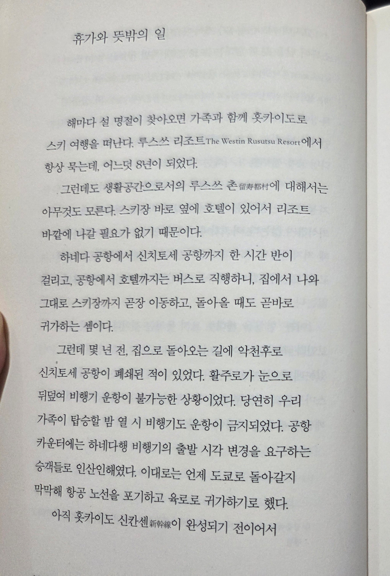 마치 독일의 비평가 발터 벤야민이 뛰어난 산책자는 익숙한 길에서도 길을 잃어버릴 줄 아는 사람이라고 역설했듯이, 아즈마 아재는 매년 가족과 갔던 그 익숙한 홋카이도 스키 여행길에서 비행기 결항이라는 사건이 생기자, 기존의 길을 잃어버리고 새 길을 찾으면서 풍경을 새롭게 재발견하는 게 아닐까. 어쩌면 이런 관광중에 생긴 사소한 사건이 아즈마의 다른 책 관광객의 철학이 탄생하는데 기여했을지도.