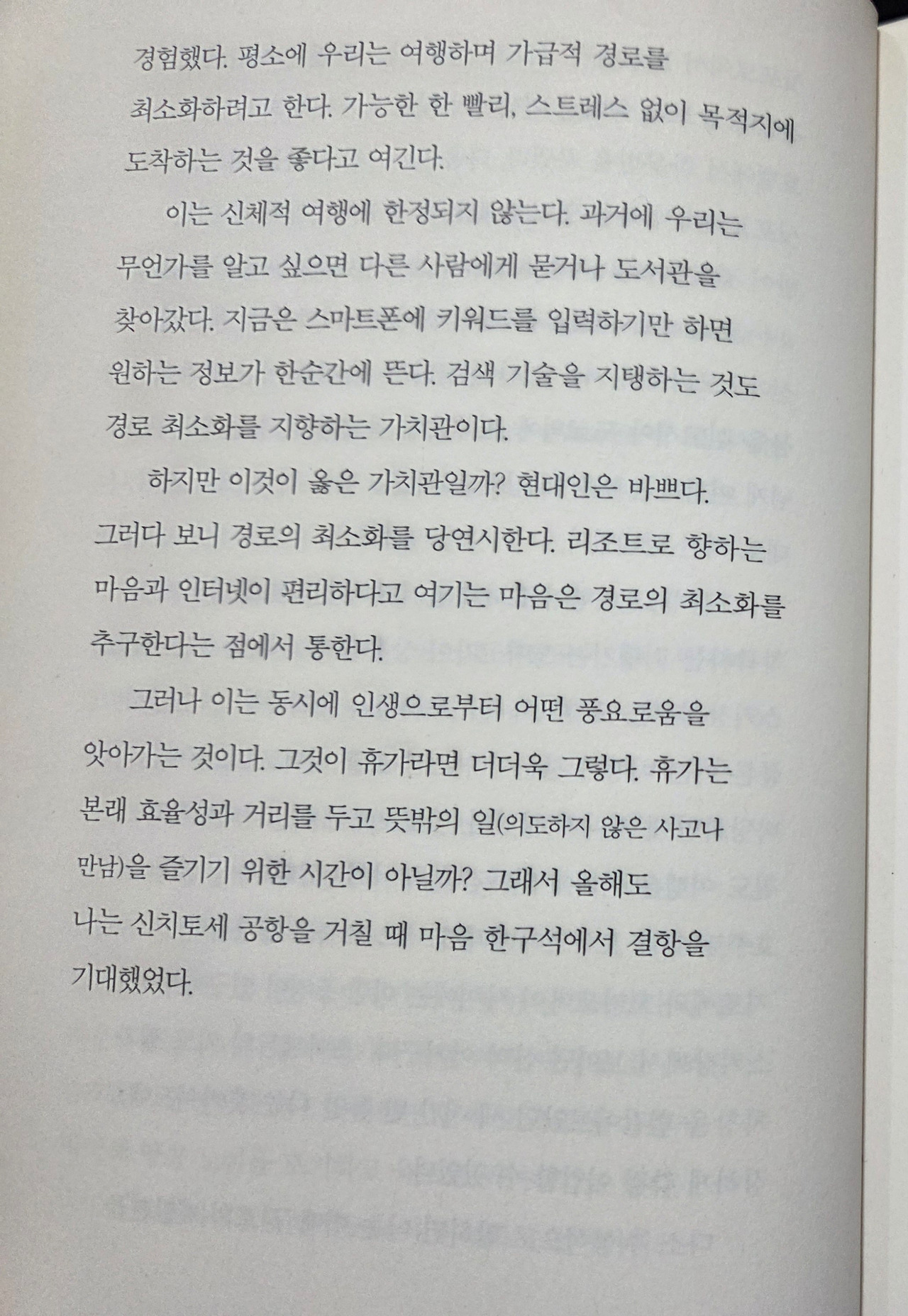 우리들, 현재인은 다들 항상 시간은 금이라는 말을 어릴 적부터 지겹게 들으며 살았고 그래서 항상 어딜 이동하든지 최소경로 최소시간으로 가려고 부단히 노력한다. 신체적 이동 뿐만 아니라 필요한 정보를 찾으려는 비물질적인 검색 기술도 그렇다. 하지만 이는 인생의 풍요로움을 스스로 포기하거나 빼앗기는 불행한 삶의 방식은 아닐까? 심지어 그것이 휴가라면 더더욱 그렇다. 애초에 휴가는 효율성이 아니라 평소의 일상에서 벗어나서 뜻밖의 사건이나 만남을 즐기기 위한 시간이니까.