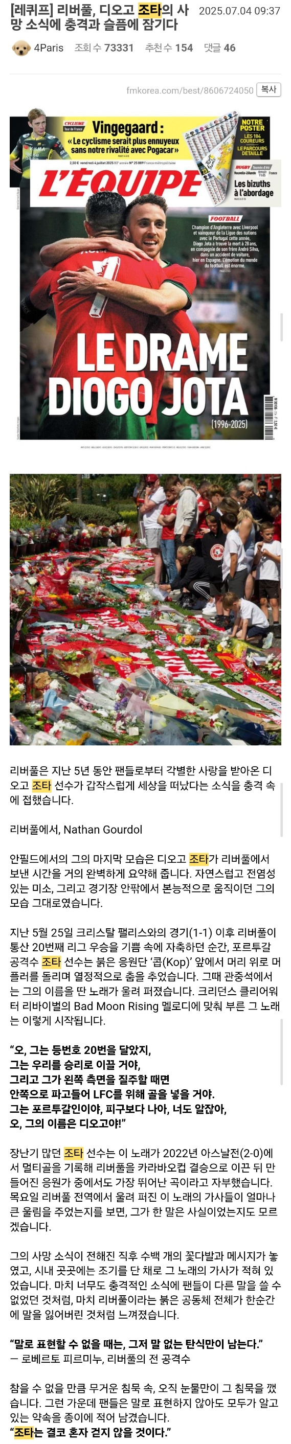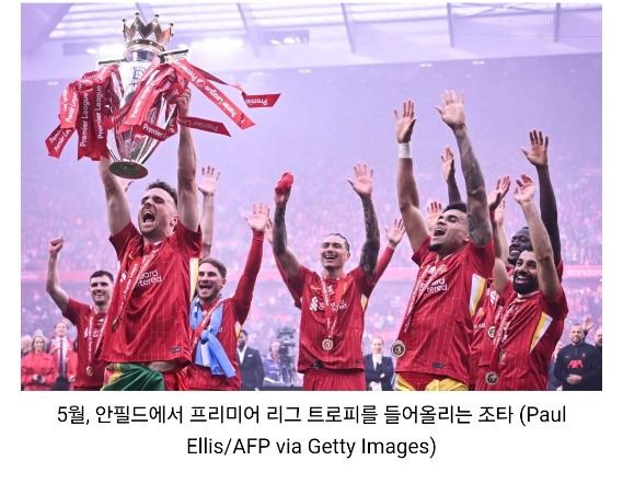 Ps. 리버풀이 구단이 디오고 조타를 20번 영구결번으로 지정하는 것에 그치지 않고, 무려 수백억의 2년 잔여 연봉을 가족에게 모두 지급하겠다는 뉴스가 나왔다.