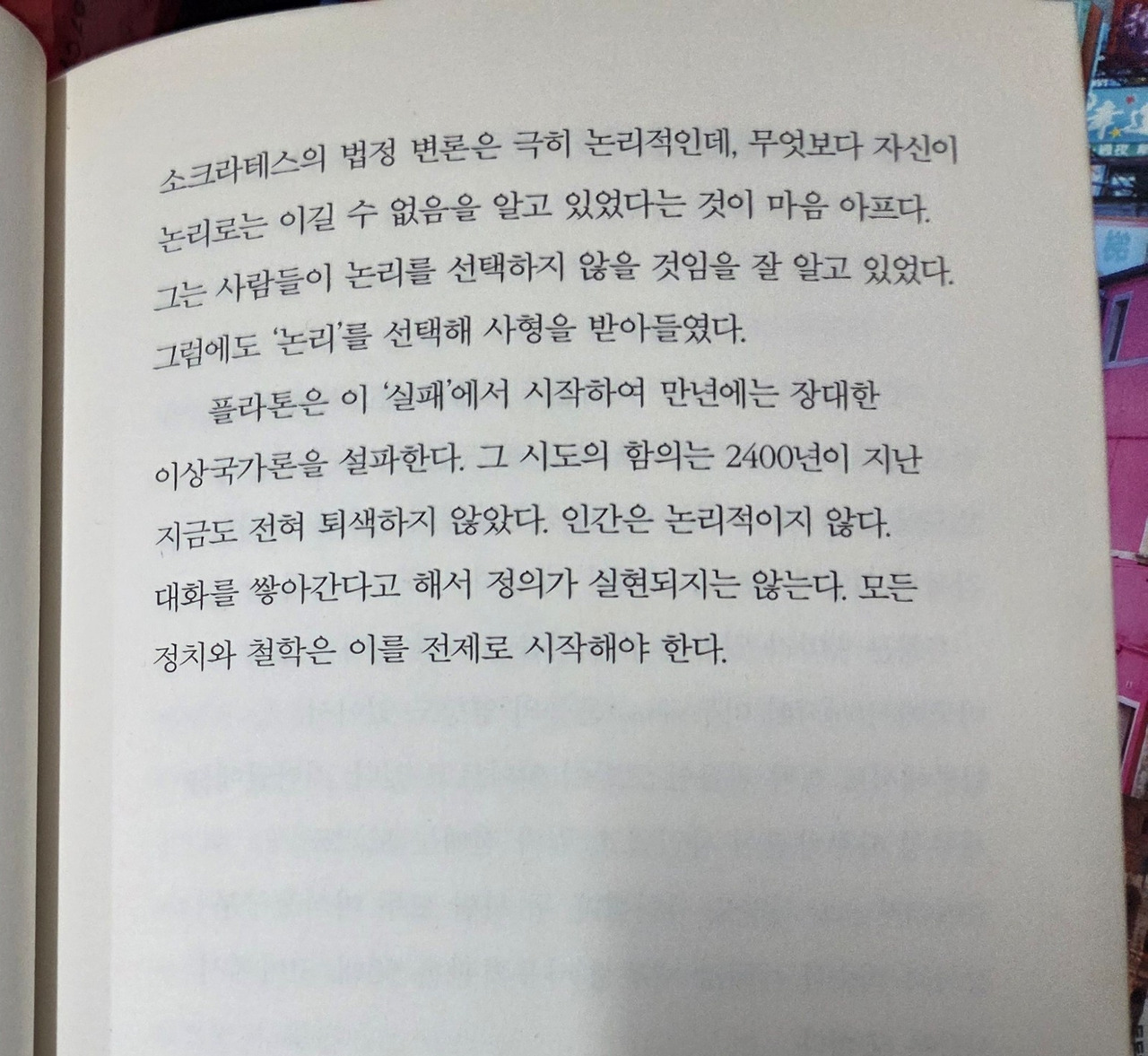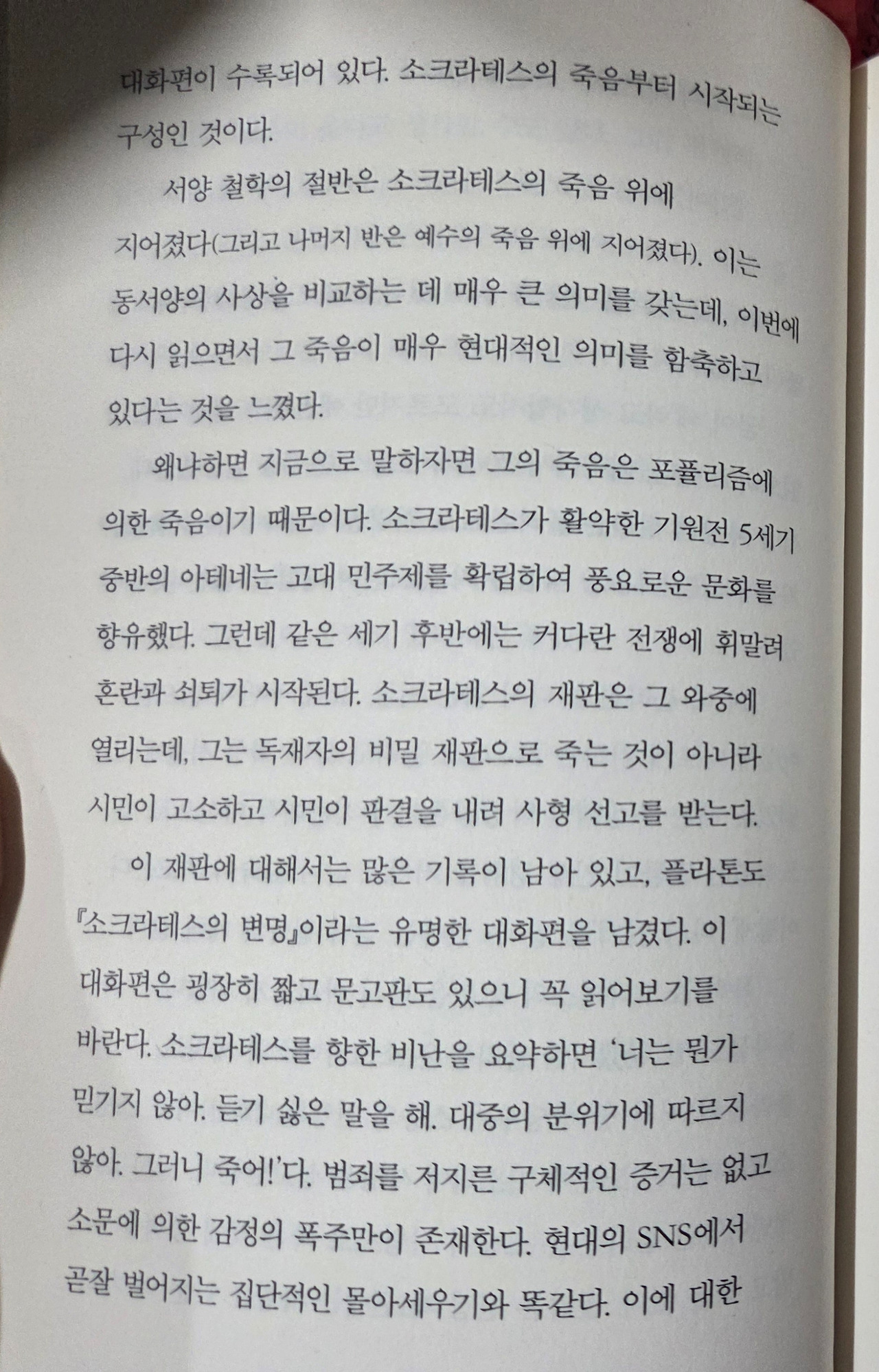 특별히 명백한 죄목도 없이 너는 뭔가 믿기지 않는 말을 한다 너는 대중의 분위기와 다른 요상한 말로 젊은이들을 선동한다 그러니 사형! 등의 감정의 폭주가 넘실거리는 아테네의 민주 법정. 이는 현대의 인터넷 sns에서 벌어지는 범인 몰기와 조리돌림의 현장과 하나도 다를 바가 없지 않은가