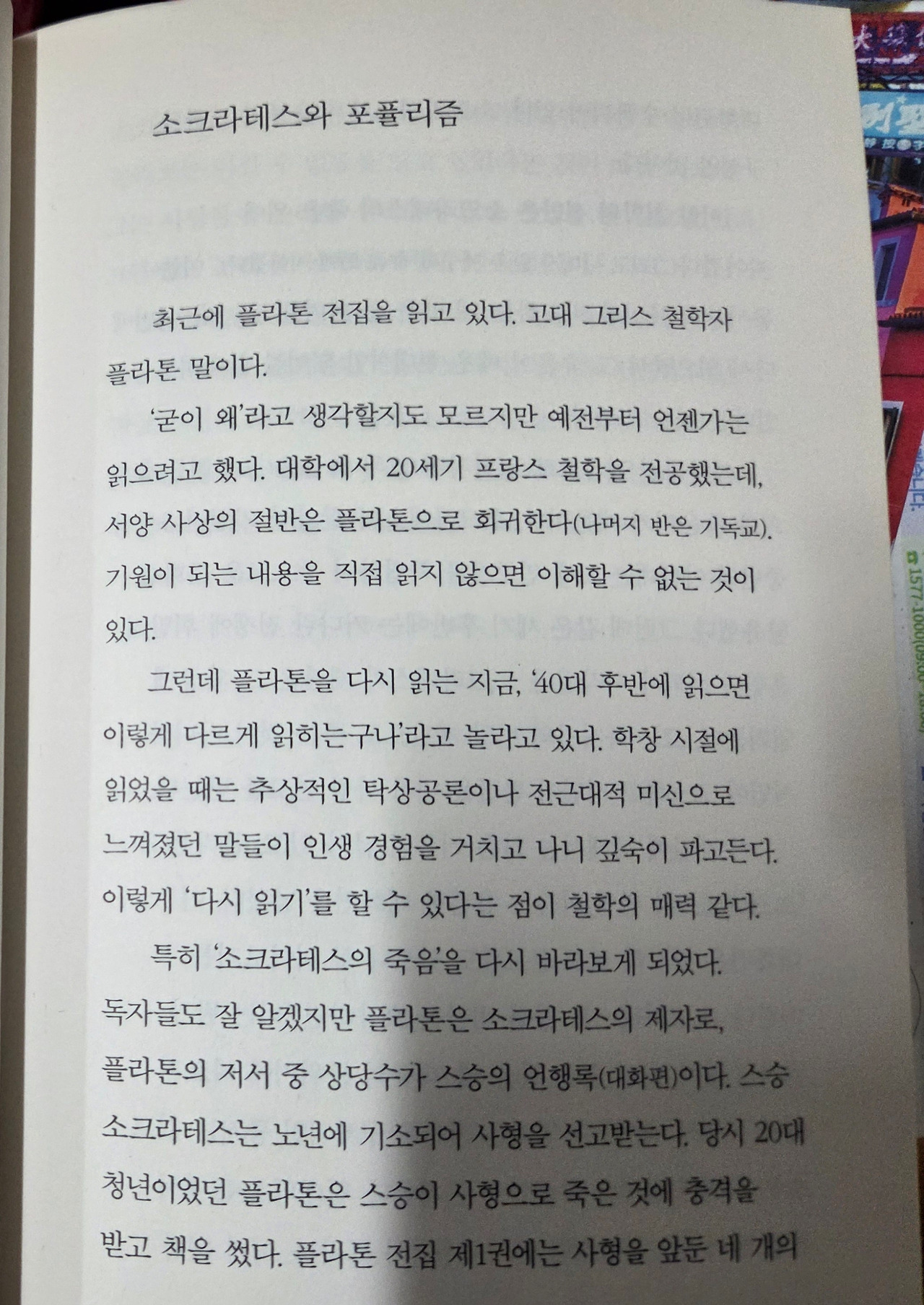 서양 유럽 철학의 절반은 플라톤, 다른 절반은 기독교라는 언명은 과감하지만 꽤나 거부하기 힘든 마치 수학의 공식같다. 바로 그 플라톤이 스승으로 모셨지만 스승의 죽음을 집단적으로 승인한 충격적인 아테네의 민회에 대해 20대의 플라톤이 분노하지 않을 리가 없다. 아즈마 아재도 분명히 20대 학부생 시절에도 읽었을 테지만 20년 지나 40대에 읽으니 또 다르게 읽히는 고전의 감칠맛.
