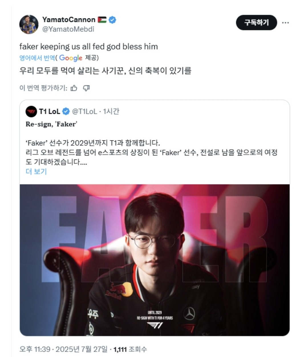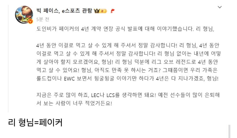 페이커를 리 형님이라 부르며 감사하고 찬양한다