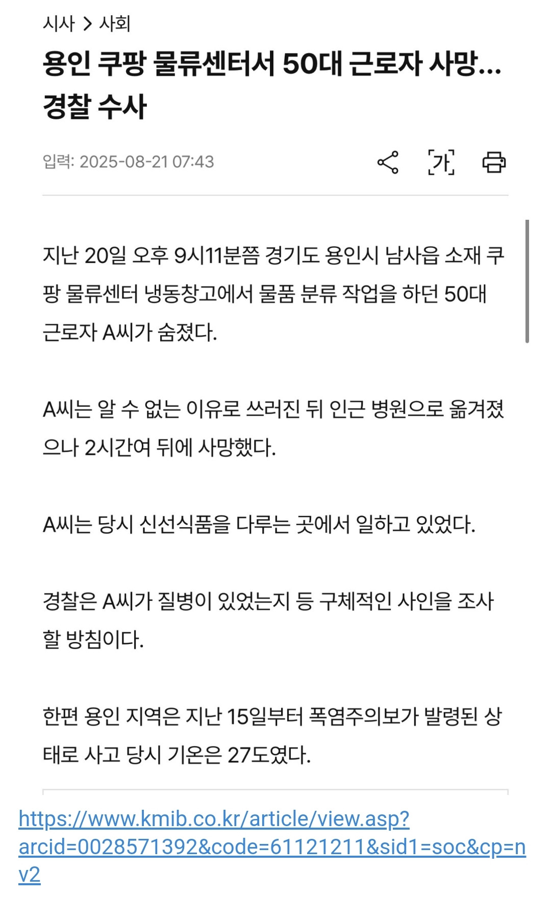 -쿠팡물류센터에서 일하던 50대 노동자가 근무중 사망했다는 속보입니다 모든 노동자들은 근무시 충분한 휴식과 포도당과 물 섭취를 필수적으로...