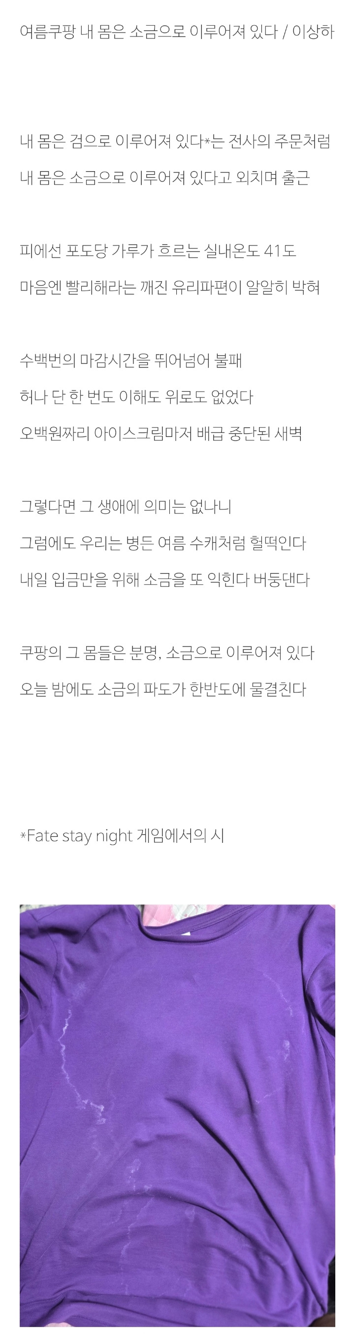 이 괴롭고 힘들었던 몸의 감상과 기억 또한 소중하다. 왜냐하면 그런 오늘의 삶의 괴로움과 외로움 또한 내 글의 소재가 되어주니까. 언젠가는 이 글들이 축제처럼 빵 굽는 타자기 아니지 밥 찌는 타자기가 될테니까. 오늘도 그저 장지역으로 출근해서 염전노예처럼 내 몸에서 소금을 뿜어내고 지쳐 탈진했지만, 바로 그런 경험이 아니면 절대 나올 수가 없는 글이, 나만이 쓸 수 있는 시가 존재하니까.