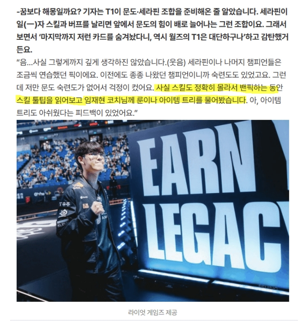 어느새 결승전이 내일이다. 티원 페이커의 6번째 월즈 우승, 그리고 새 팀원 도란의 첫 번째 우승이 꼭 이뤄지기를 온몸으로 응원한다