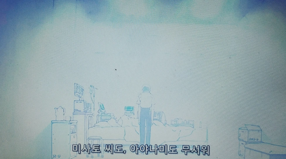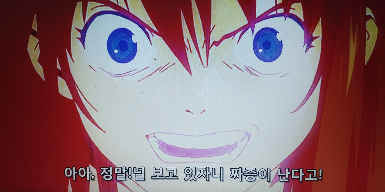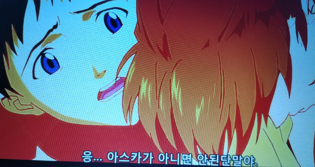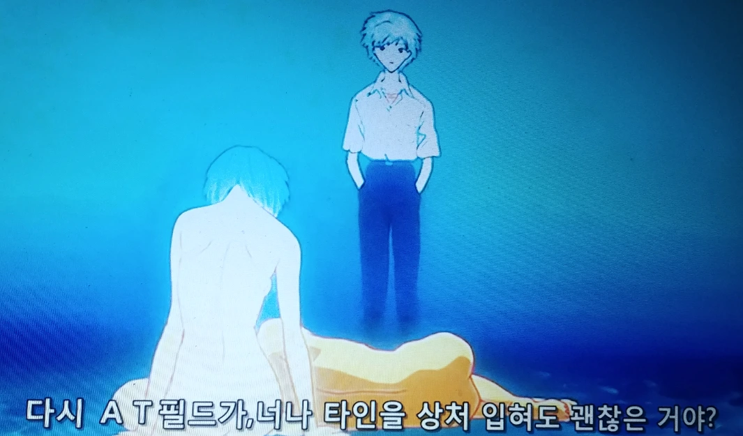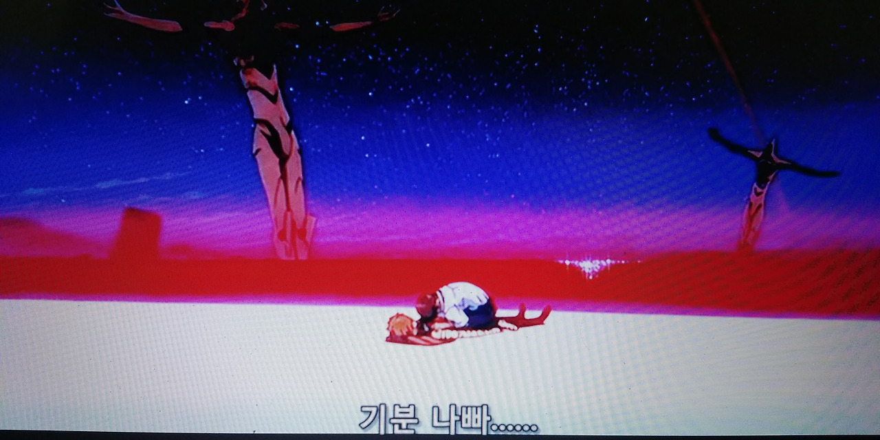 하지만 지난번 글에서 말했듯이 카오루와 미사토가 자기희생을 하며 베풀어준 사랑 덕분에 신지는 아주 약간 정신을 차리고 초호기에 겨우 탑승하게 된다. 하지만 아스카와 2호기는 바보 신지는 왜 오질 않느냐며 혼자 싸우다가 제레에서 보낸 양산형 에바 시리즈에 이미 잔혹하게, 너무나 잔혹하게 당했고 서드 임팩트가 시작되자 모두의 영혼이 육체에서 해방되어 어머니 리리스 앞에서 하나가 된다. 그리고 더 이상 타인이라는 공포와 외로움이라는 불안이 없는 세계가 완성될려는 찰나, 단 한명이 그런 결정을 내리려는 신지에게 반기를 든다.