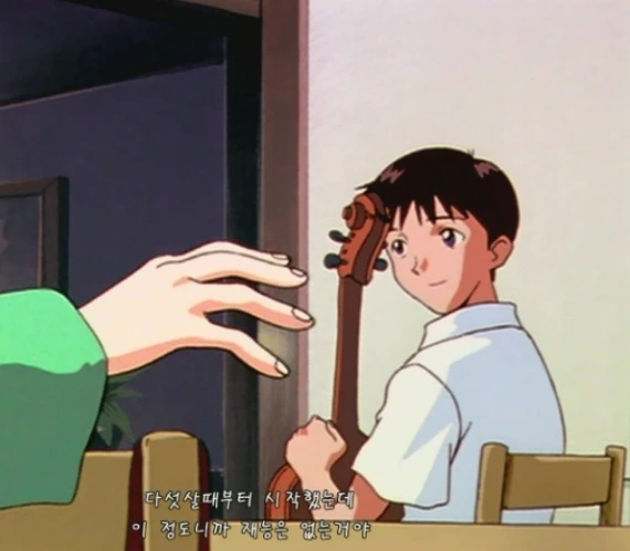 신지는 서드 임팩트의 융합중에 살아온 인생을 돌아보면서 첼로를 처음 배웠던 순간을 떠올린다. 스스로 아무 능력도 없는 무기력한 멍청이라고 칭하며 자기혐오의 끝장을 달리던 신지였지만 사실은 음악적으로 분명 재능이 있는 아이였던 것이다. 세컨드 임팩트와 부모로부터 버려진 환경 때문에 그 재능을 제대로 계발할 기회가 없었던 것 뿐. 첼로를 배우고 연주할 때의 신지는 분명 니체가 원한의식에서 더 높은 계단을 오르는 원동력이라 말한 삶의 기쁨, 즐거움을 온몸으로 느끼고 실천했던 순간이 아니었을까.