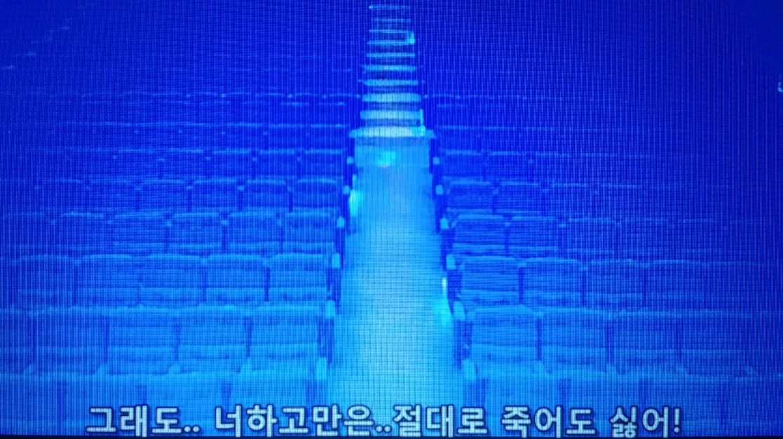 너하고만은 죽어도 싫어. 아스카 목소리의 완벽한 거절에 갑자기 화면은 영화관의 관객석으로 전환된다. 마치 아스카가 말한 '죽어도 하나가 되긴 싫은 너' 라는 말이 애니를 보고 있는 관객들 하나하나를 가리키는 듯. 영상은 아에 당시 영화를 보고있는 관객들로 카메라를 돌린다. 이것은 결코 그냥 만화로 끝나는 이야기가 아니라고 대놓고 말하는 안노의 의도가 아닐까.