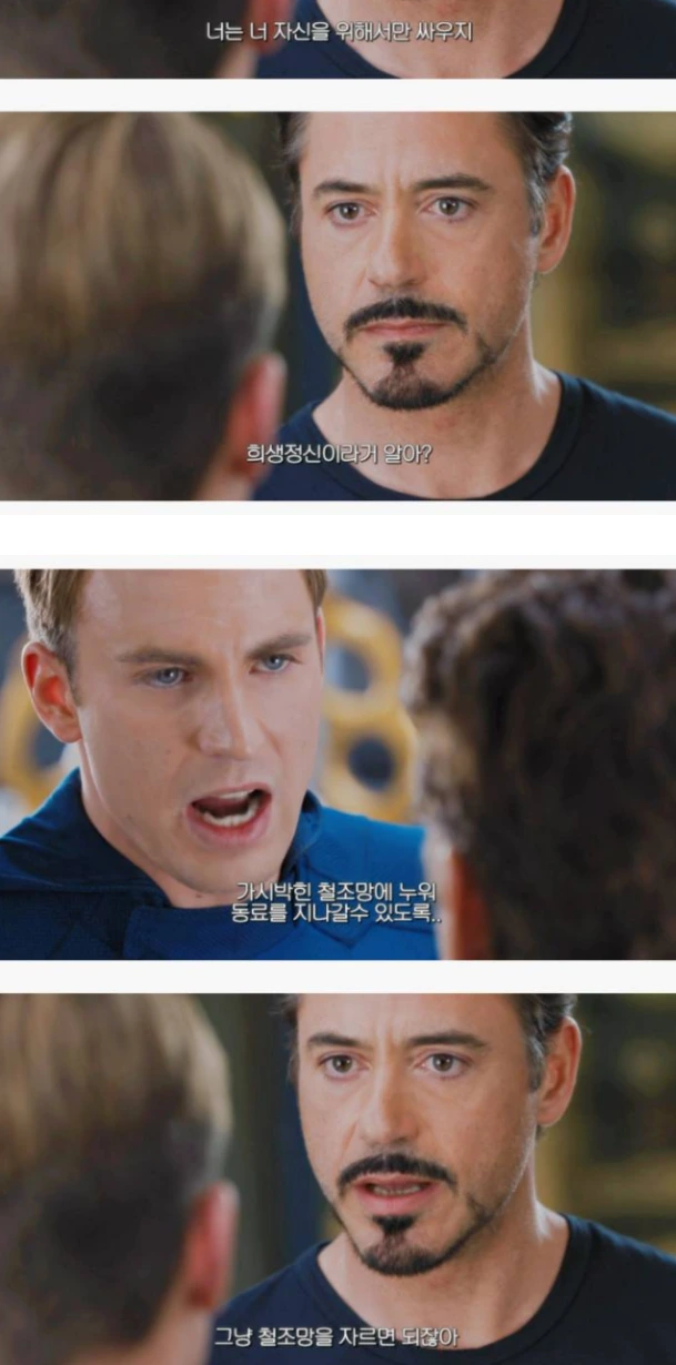 니체도 네가 폭군이라면 벗을 가질 수 없고, 네가 노예라면 친구가 되어줄 수 없다고 말한 바 있다. 이를 따라 좀 비약해서 심하게 말하면 어벤저스 1의 캡틴은 무조건 국가와 쉴드의 명령을 따라야 한다고 보는 군인, 노예였고, 반대로 토니 스타크는 국가건 뭐건 아무것도 믿지 않으며 자기 마음대로만 행동하는 사고뭉치 폭군이었다.