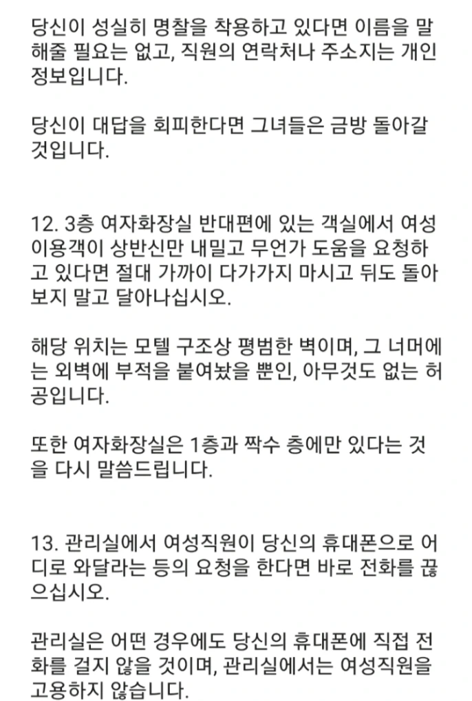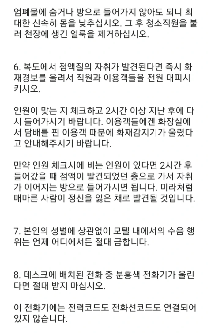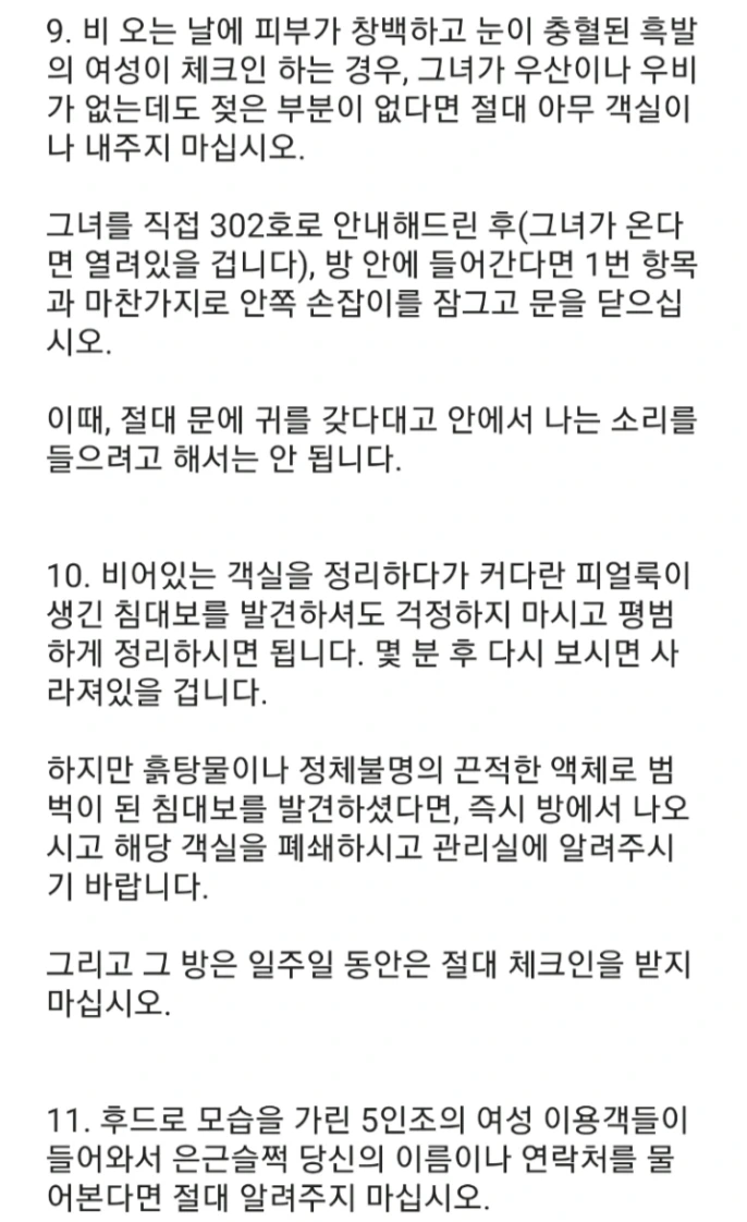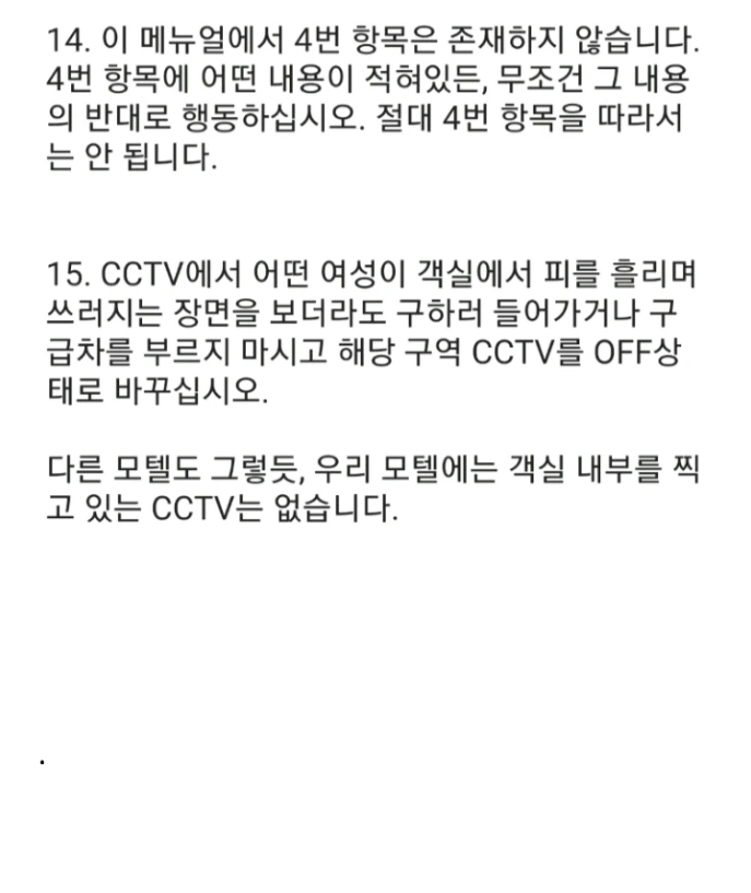 17. 최근 모텔에서 추가 공사로 지하 4층까지 추가 객실이 완공되었습니다. 지하 4층은 vip룸이니 일반 직원은 절대로 언급조차 해서는 안 됩니다. 때때로 지하 4층에서 토마토 쥬스 주문이 내려올텐데 그때는 주방장에게 "토마토"라고 말만 하면 주방장은 알아서 모든 걸 알겠다는 듯이 냉장고에서 익숙한 액체를 꺼내서 처리해줄 것입니다. 참고로 우리 모텔은 모텔 주인분의 알러지 때문에 토마토 쥬스는 매입 금지 품목이니 꼭 숙지하시길.