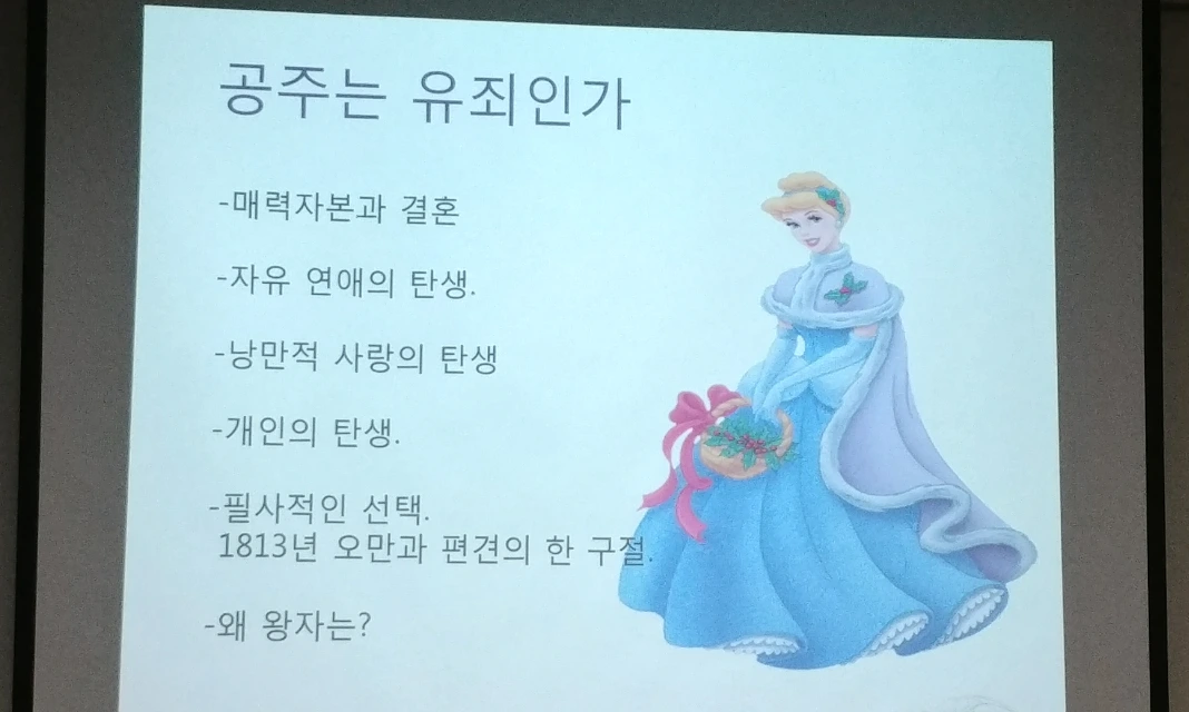 이제 다시 지난 강연 이야기로 돌아가보자.최현미 기자이자 작가님은 자신도 딸을 키우는 50대 여성으로, 딸에게 디즈니 애니를 보여주는 것이 자칫 여성은 예쁘고 귀여운 공주여야 한다는 전형성을 의식적으로 강제하든지 무의식적으로 주입하든지 간에, 정치적으로 올바르지 못한 게 아닐까 고민했었다고 하셨다. 하지만 과연 동화 속 공주들이 그 자체로 문제고 유죄인 것일까? 우리는 자칫 이런 과거에 대해 평가할 때 단순히 현재의 기준과 잣대를 쉽게 갖다대는 오류를 범하지는 않는지 경계할 필요가 있지 않을까?