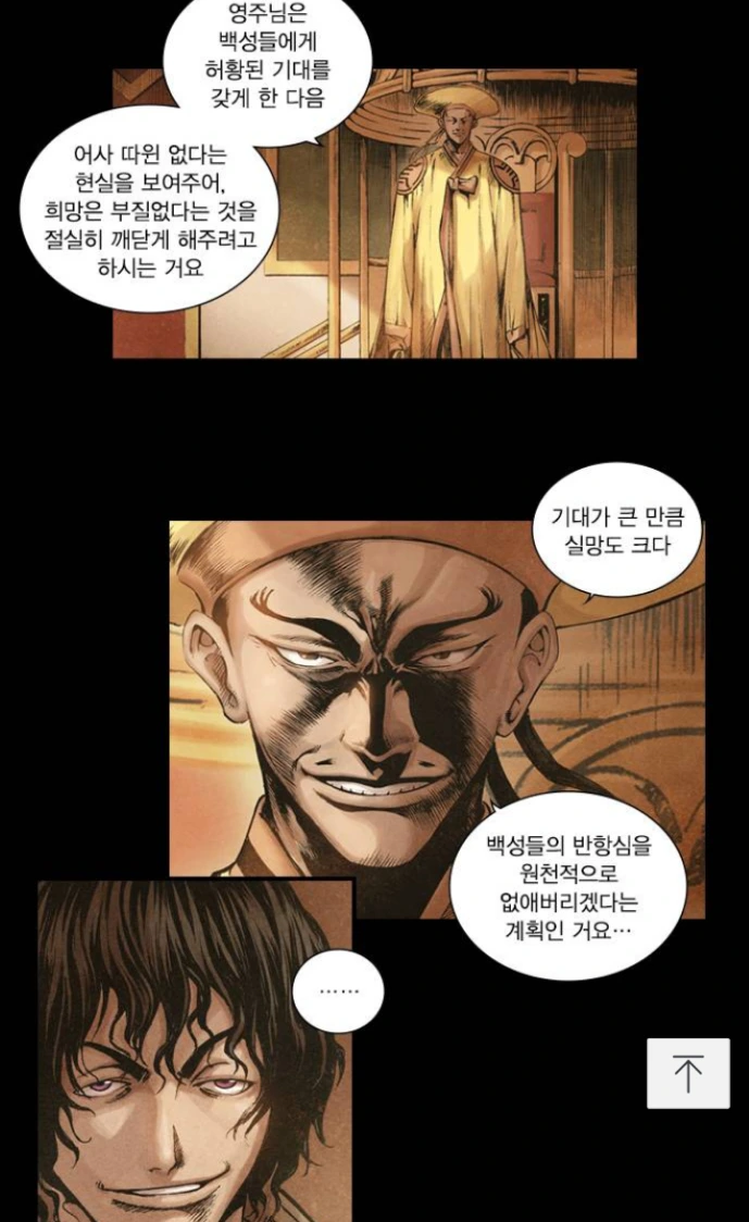 인간은 언제 절망할까. 절망 중에서도 가장 큰 절망은 언제 느낄까. 그것은 바로 미래에 대한 기대, 희망을 가졌다가 그 희망이 부서졌을때 인간은 절망한다. 기대와 희망이 크면 클수록 그 절망의 골짜기는 한도 끝도 없이 더욱 깊어진다. 그래서 영주는 하나의 계략으로 암행어사가 정의를 집행한다는 소문을 풀었고, 사람들은 그 희망에 기대다가 젊은 나그네가 암행어사가 아니라 자신들을 속이고 억압한 영주라는 현실에 엄청난 절망을 맛보게 된다. 문수가 나타나기 바로 직전까지 말이다. 이런 악한들에 대항하기엔 단순히 선이니 정의감이니 하는 정신이 아니라 니체가 말하듯 사람들 사이에서 어떤 잔으로든 물을 마실 줄 알아야 하고, 아군마저 속일 수 있는 뛰어난 연기와 책략이 필요한 것이다.