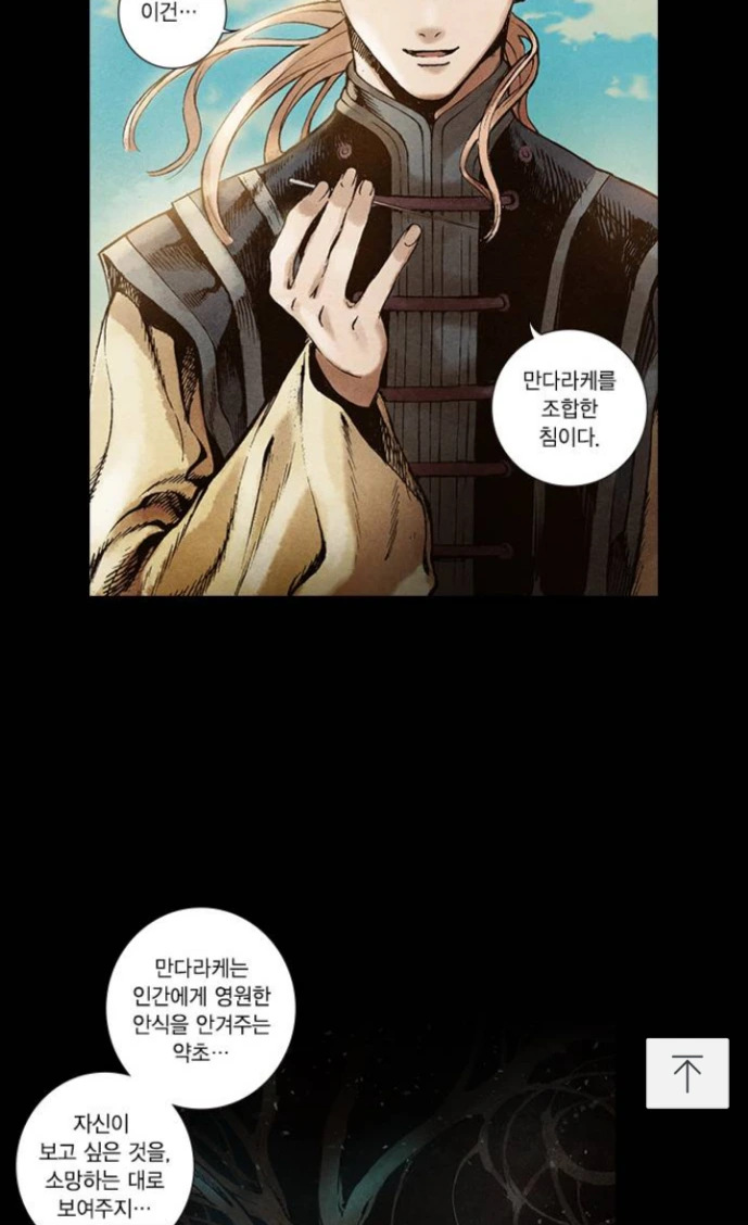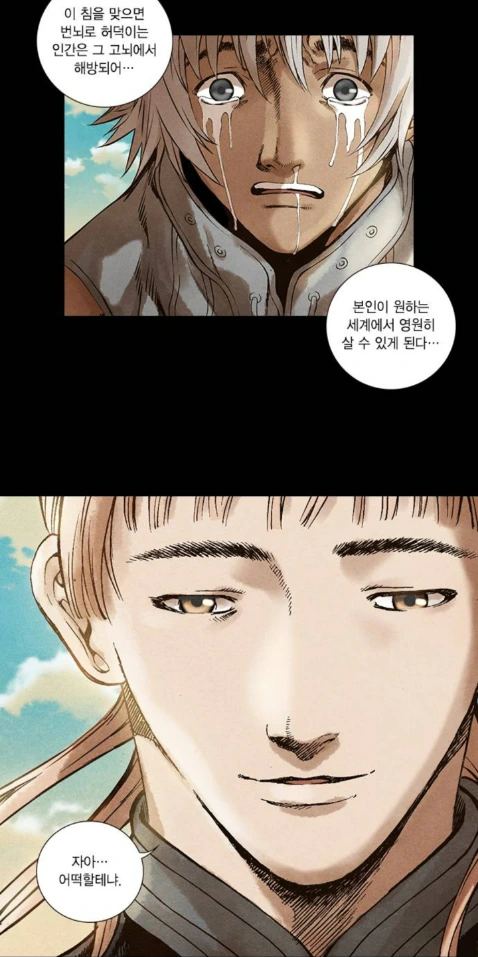 유의태는 허준에게 마을 사람들을 살려낸 만다라케 침의 비밀을 밝힌다. 이 침은 일종의 환각제로, 사람을 고뇌에서 해방시키고 자신이 원하는 세계에서 영원히 살 수 있게 해주는 침이었다. 허준과 섬 사람들은 전염병으로 죽는 게 아니라 살기를 원했고 유의태 자신은 그 소원을 들어줬을 뿐이라고... 이는 전형적인 악마가 인간의 소원을 들어주는 스토리텔링이 아닌가. 허나 이런 유의태의 자기변호를 문수는 단칼에 잘라버린다.