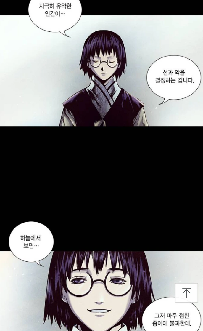 하나의 종이를 마주접은 것처럼 사실 선과 악은 하나다. 지극히 유약한 인간이 원래 아무것도 아니었던 것을 자기의 잣대로 선과 악의 색깔을 정하지만 하늘에서 보면 그저 마주 접힌 종이에 불과하다...결국 인간이 정한 선악따위 무의미하다는 말이나 다름없다. 인간을 위해서 악수를 퇴치하는 일이 선이라 믿는 장군 문수에게 사실상 이때부터 아지태는 선전포고한 것이나 다름없는 것이다.