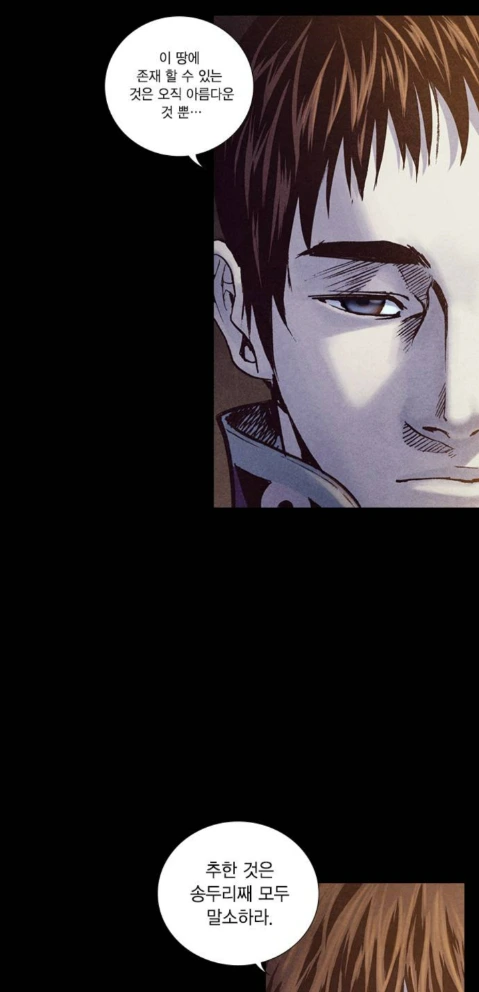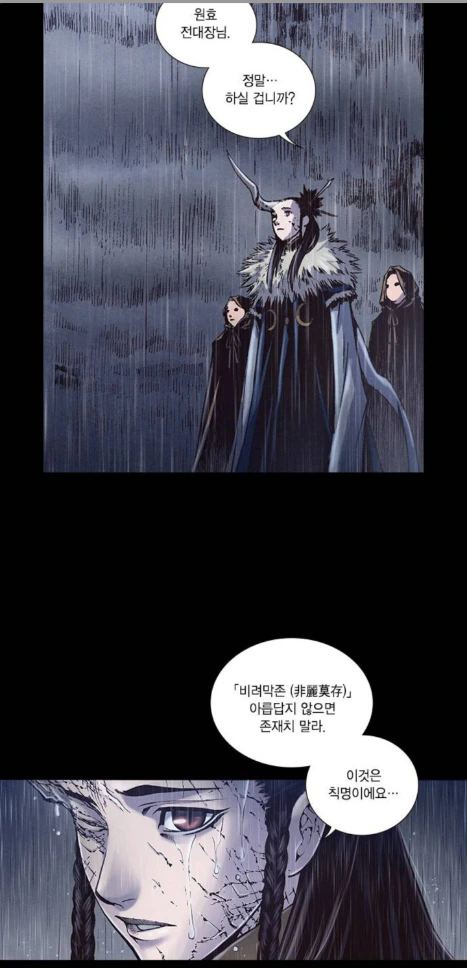 한편 전쟁후 쥬신의 장군을 그만두고 서양으로 계월향과 함께 외교겸 여행을 떠난 문수는 반역자로 몰려 쫓기는 신세가 되었다. 불치병이라 생각했던 계월향의 병을 새크로피아라는 악마의 주술로 자신에게 옮겨 약해진 문수는, 서양에서 조용히 지내려고 했으나 쥬신이 뭔가 잘못되고 있다는 소문을 듣고 다시 돌아오게 된다. 왕의 칙명으로 행해지고 있다는 비려막존. 아름답지 않으면 존재하지 말라는 한다는 왕명으로 쥬신에선 말도 안되는 대학살이 벌어지고 있는 중이었다. 이는 지난 글에서 말한 것처럼 차라투스트하의 자기 긍정의 사상과는 반대편의, 질투와 혐오와 부정으로 가득찬 사상이 아닐 수 없다.