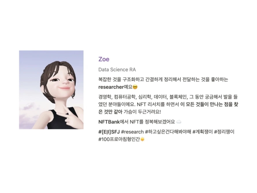 그래서 NFTBank라는 곳에 꽂혔을 때에도 직감적으로 내가 결국 여기에 가게 될 것을 알았다. 하지만 당시 나는 석사 두 학기 째 대학원생이었고, "그냥 이거 하고 싶어요. 대학원 그만둘래요." 라고 교수님과 부모님을 설득할 수는 없었다. 전과 달리 성인이 되고 내리는 큰 결정이다보니 스스로도 논리적으로 납득할 수 있는 이유가 필요하다고 생각했다.