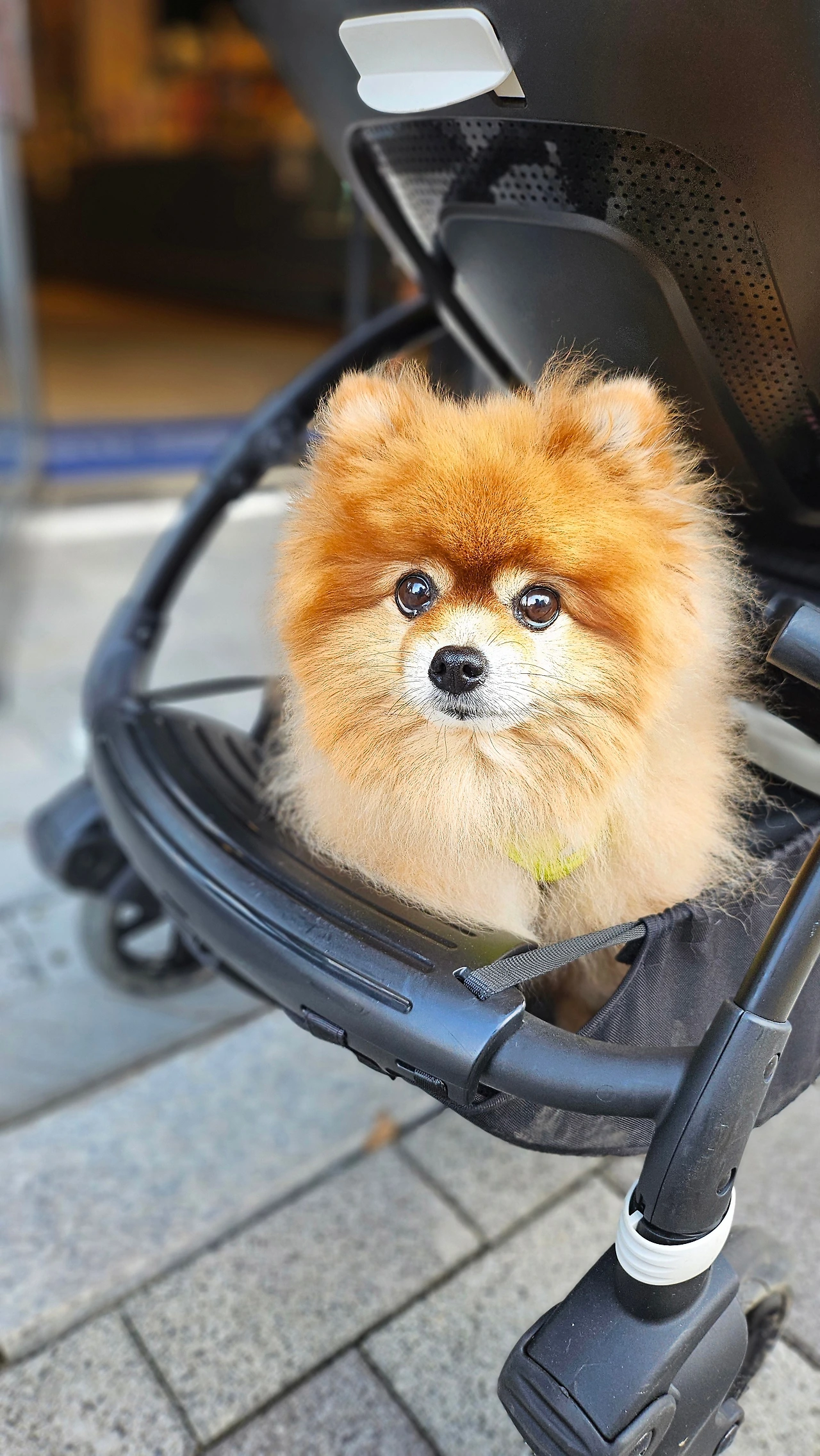 온전히 언니의 사랑을 독차지하던 조이가 아기 유모차 아래에 있다.