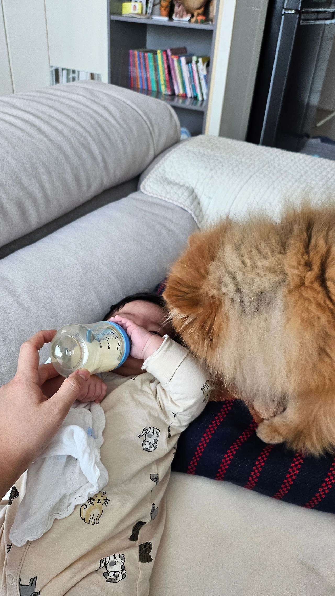 아이가 분유를 먹을 때도 쪼르르 달려와 아이옆에 찰싹, 머리 냄새 킁킁.. 아이에게 온 사랑을 쏟는 느낌이다.
