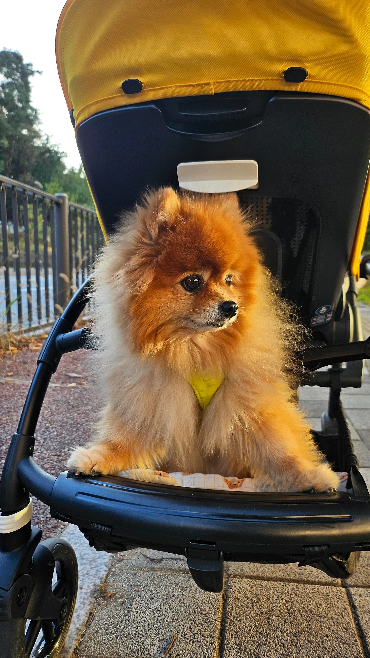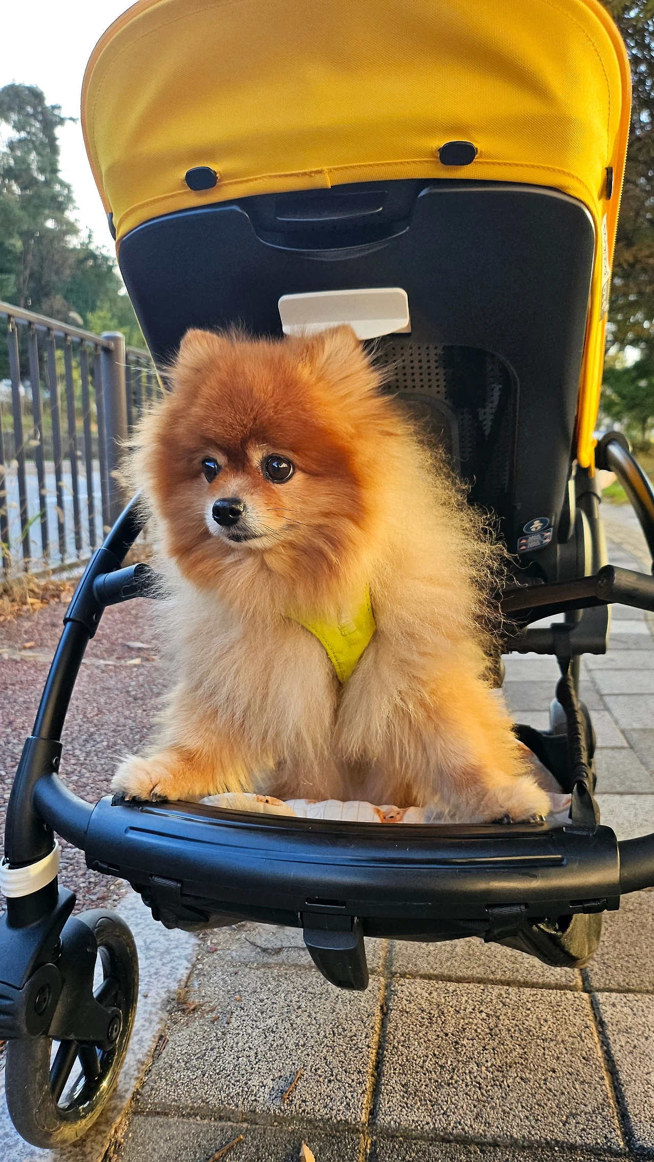 매일 강아지 유모차를 타던 조이가 아래를 지킨다.