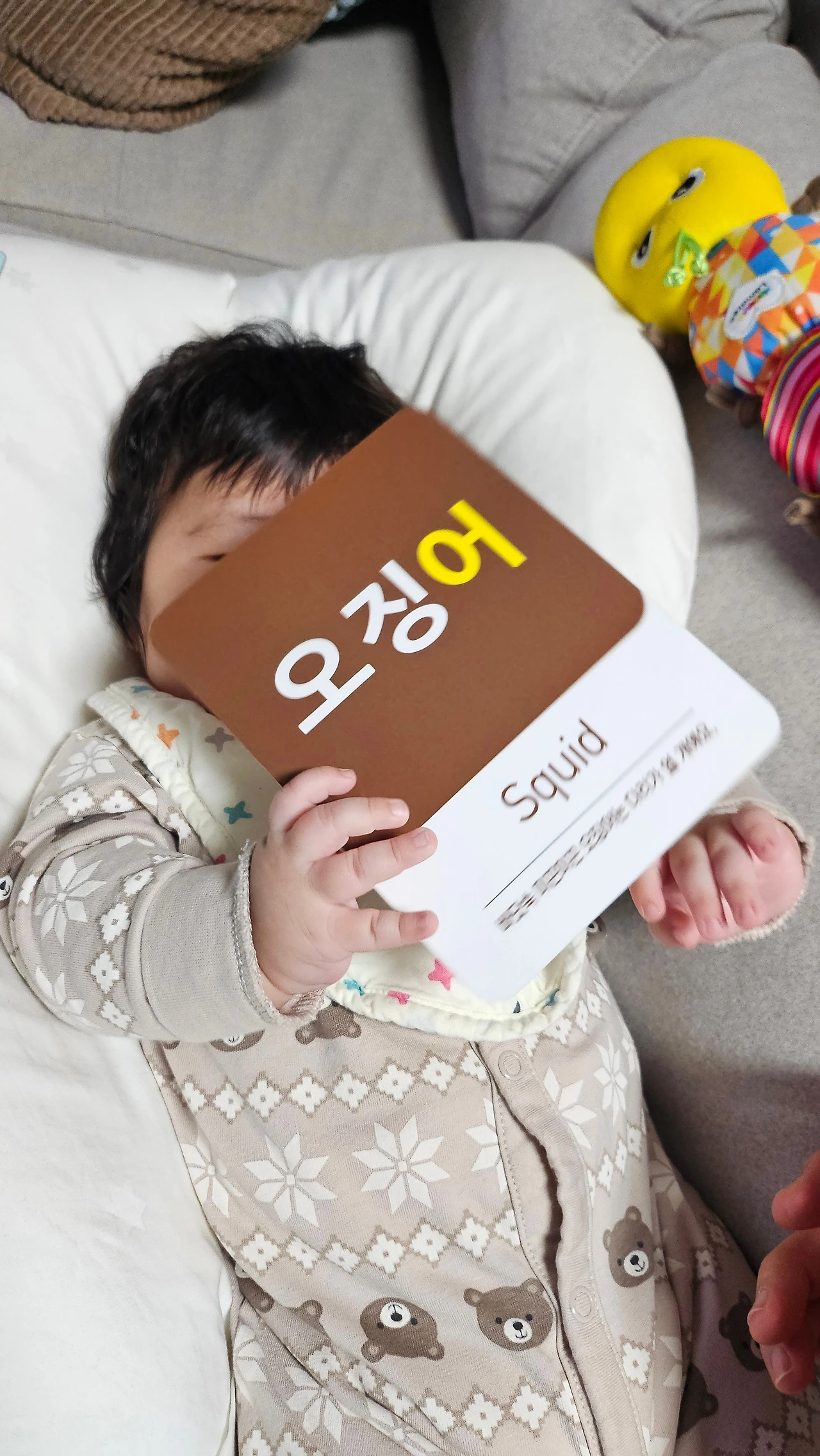 매일 그림책만 보다가 실물 카드를 보니 눈이 휘둥그레진다. 신기한지 손으로 잡고 만져보고 엄마가 설명하는 모습을 진지하게 쳐다보기도 한다.