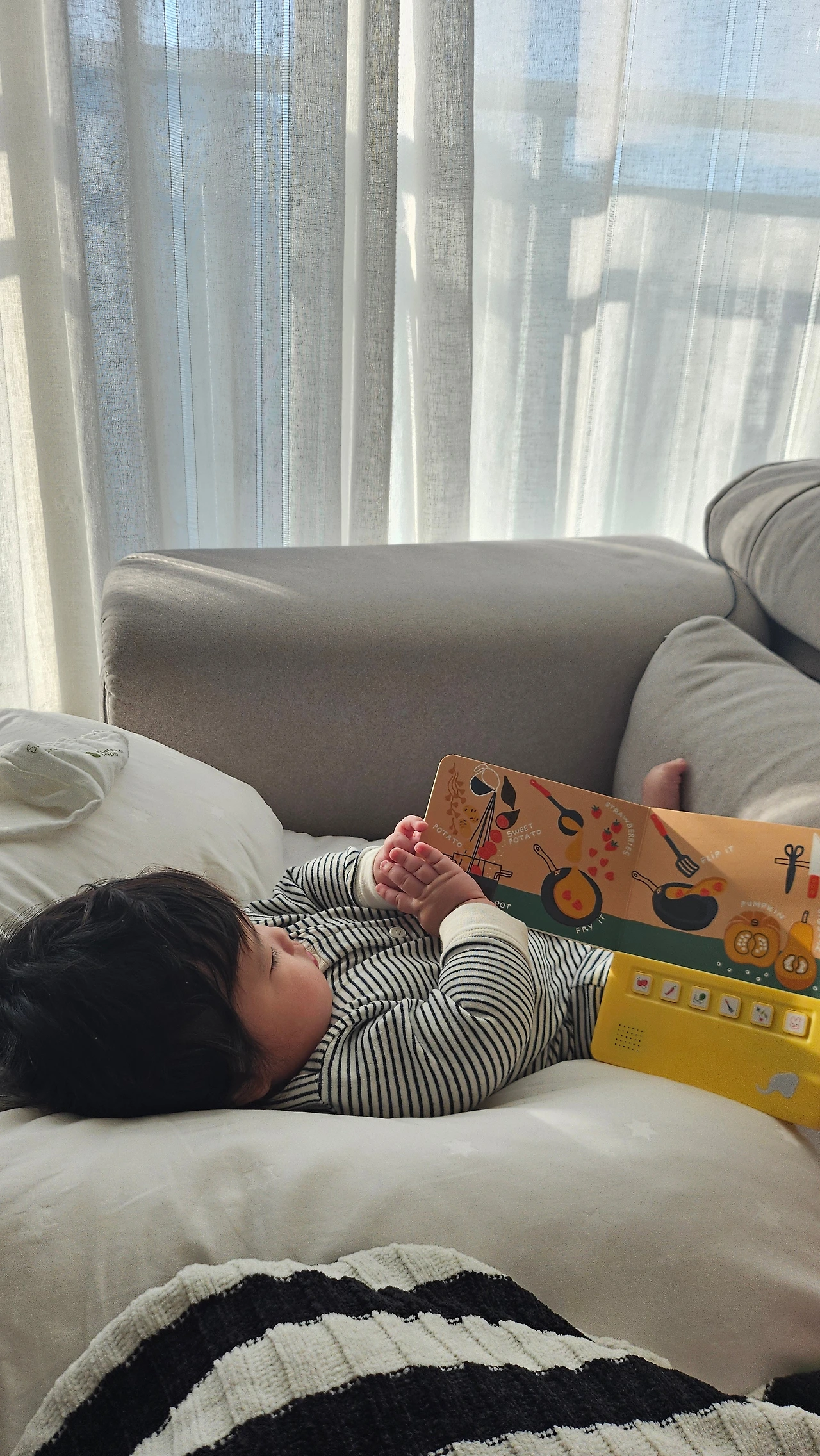 카메라를 볼 줄 알고 책장을 넘기고 장난감을 가지고 놀고 함께 할 수 있는 일이 많아지니 더 즐거워진 것 같다.