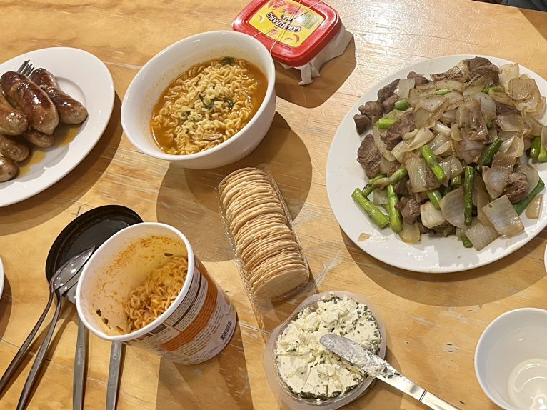 오늘은 방을 옮겼고 내일이면 내가 다른 백패커스로 간다. 그래서 마지막 파티처럼 푸짐하게 차렸다. 외국에서 먹는 라면의 맛은 따로 설명할 필요가 없다. 라면은 외국에서 먹을 때 백 배는 더 맛있다. 아래쪽으로 보이는 크림치즈도 아주 끝내줬다. Spring onion & Chive가 들어가 있는데 파와 부추 같은 허브류라고 생각하면 된다. 손이 계속 가서 내가 거의 다 먹었다. 마성의 맛이다.