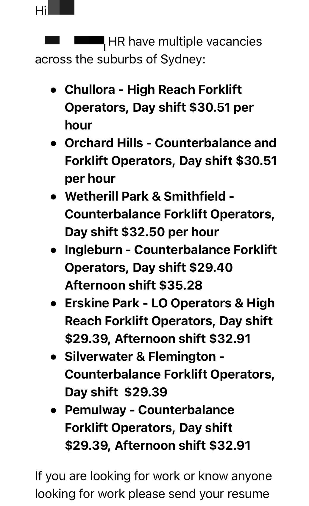 이게 바로 내 치트키의 위엄이다. 나는 훗날 HR회사(인력회사)를 통해 취업을 하게 됐다. 포크리프트 운용 자리에는 취업할 수 없었지만 그 회사를 그만둔 다음 이런 메일을 계속 받았다. 평균 30달러쯤 되는 일자리가 비어있으니 일자리를 원한다면 답장을 달라는 메일이다. 이때 호주 캐주얼 최저시급이 25달러 정도였다. 이 메일들로 내가 애를 쓰고 해 뜨기도 전에 일어나서 포크리프트 면허를 따러 다닌 이유를 설명할 수 있겠다.
