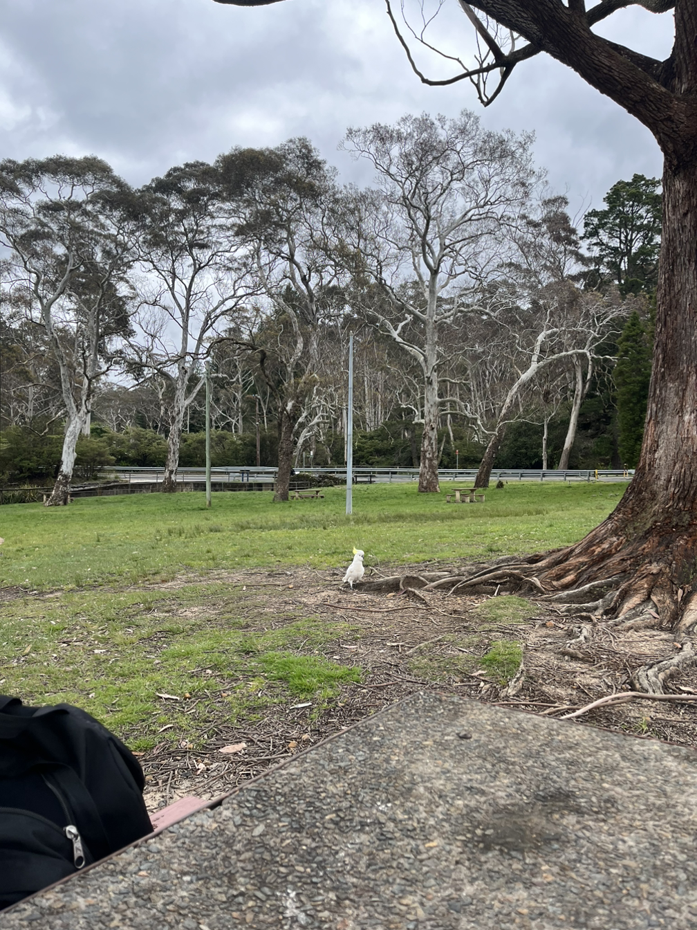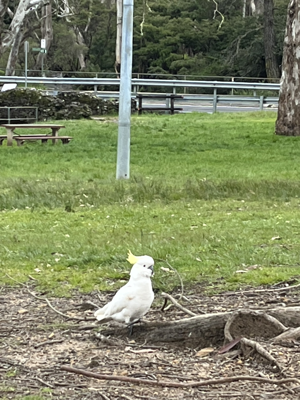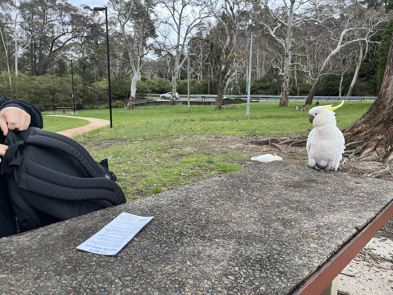 너무 놀란 우리는 꺼내놓은 음식을 마구 가방에 넣고 자리를 피했다. 우리 음식을 다 빼앗길 것만 같았다. 코카투의 눈빛이 너무 무서웠다. 코카투 덕분에 주디는 가방에 우유를 다 쏟았다. 이후로 우리는 더이상 보이지도 않게 된 코카투를 향해 계속 씩씩거렸다.