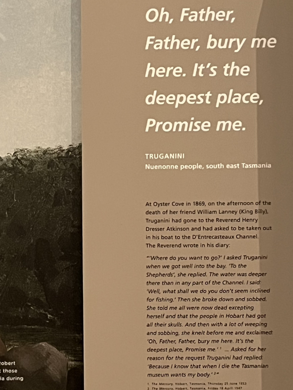 그냥 가볍게 구경을 온 건데, 처음부터 마음이 무거워졌다. "오, 아버지, 아버지, 저를 이곳에 묻어주세요. 이곳은 가장 깊은 곳이에요, 약속해 주세요." 이런 문구를 보고 지나칠 수 없었다. 영어를 공부하는 기분으로 쭉 읽어가다 마지막 부분에서 숨이 턱 막히는 기분이었다. 왜 이곳에 묻어달라고 하는지 묻자 이 소녀 트루가니니는 "내가 죽으면 태즈메이니아 박물관에서 내 몸을 원할 거란 걸 알기 때문이에요"라고 흐느껴 말했다고 한다. 옛 시절에 원주민은 백인들에게 그저 신기한 전시품에 불과했지만, 원주민들의 살아있는 영혼은 깊은 바닷속에 잠기는 한이 있더라도 화이트들의 손아귀에 놀아나고 싶지 않았던 걸 테다.