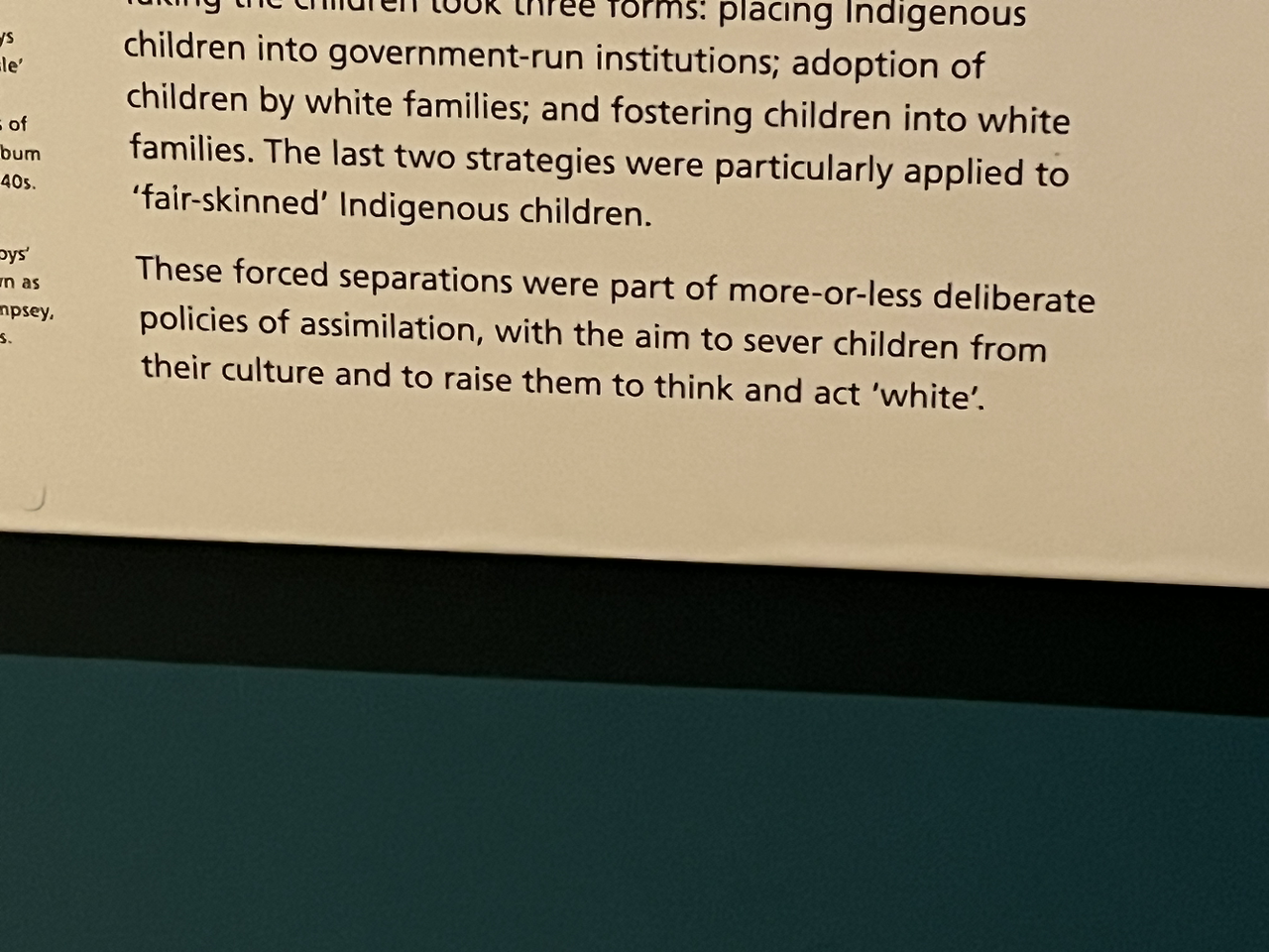 백인 가족에 의한 아이들의 입양; 그리고 아이들을 백인 가족으로 육성. 마지막 두 가지 전략은 특히 '흰 피부' 원주민의 아이들에게 적용되었습니다. 이러한 강제적인 분리는 아이들을 그들의 문화로부터 격리시키고 그들을 '백인'처럼 행동하고 생각하도록 키우려는 목적으로, 다소 의도적인 동화 정책의 일부였습니다.