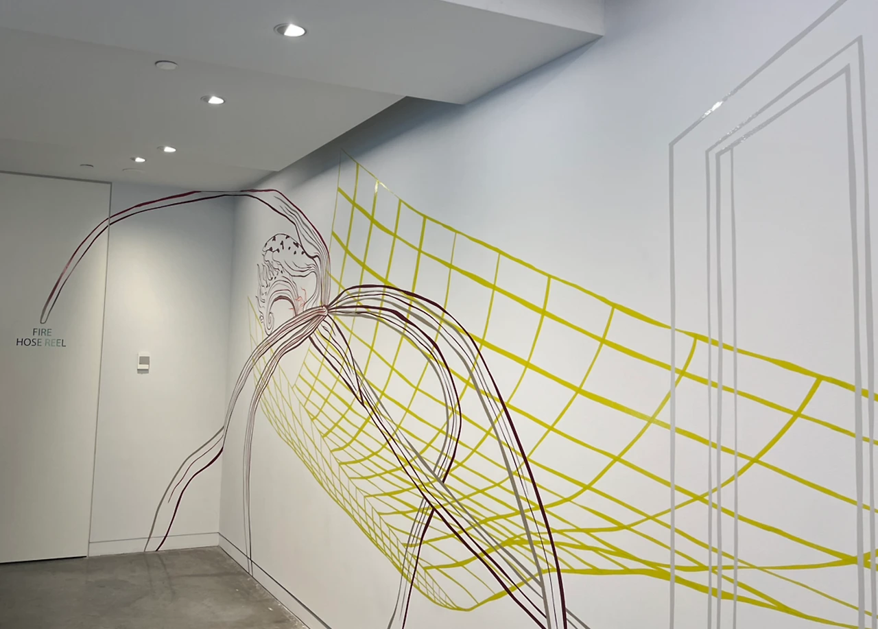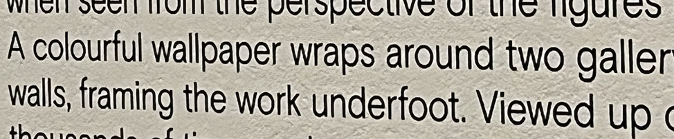 공간을 통과하고 작품의 의도를 읽다 보니 우리가 건너온 유리바닥 옆으로 컬러풀한 벽지가 있다고 한다. 내 눈에는 전혀 화려한 색지가 아니었다.