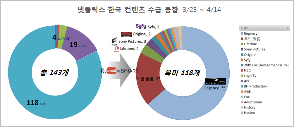처음 그래프에 보여드렸지만, Regency를 업데이트한 것을 제외한다면 43 (미국) : 25 (미국 外)로 미국 콘텐츠가 아닌 비중이 상당히 많이 올라온 것 (37%)으로 알 수 있습니다.