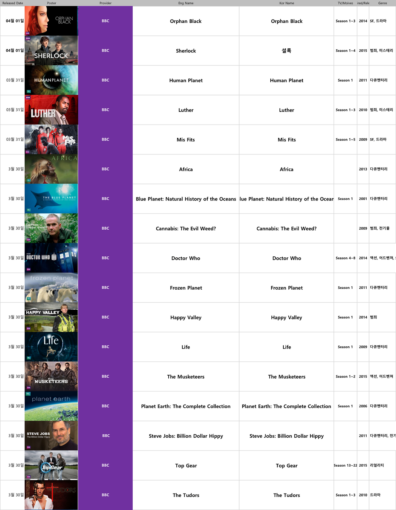 총 17개의 타이틀이 추가가 되었는데, TV Series로는 셜록을 비롯, Orphan Black, Luther, Mis Fits, Doctor Who(닥터 후), Happy Valley, The Tudors, Musketeers (삼총사) 등이 추가가 되었고, 차기 시즌에 매튜 르 블랑이 돌아오는 탑기어가 추가가 되었습니다.
