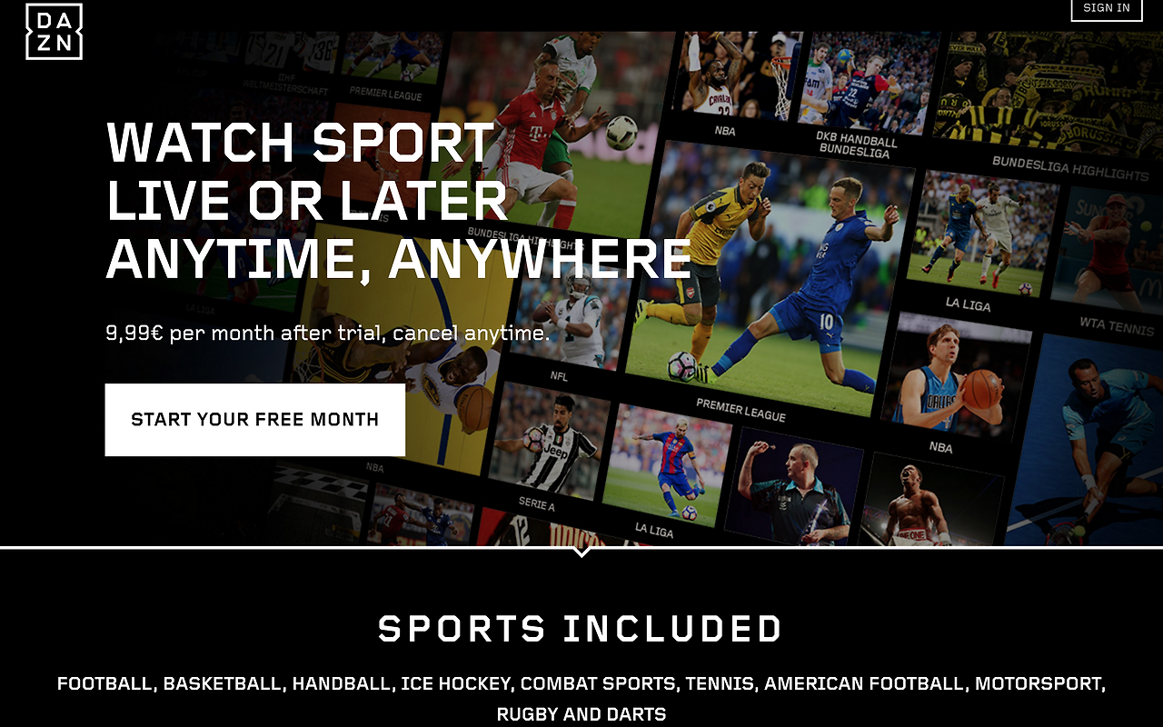 축구 OTT를 기존에 선보였던 영국의 퍼폼(Perform) 그룹이 8월에 론칭한 서비스인 데이즌(DAZN)은 말 그대로 세계 최초로 선보이는 신개념의 스포츠 OTT입니다. 독일에서 1차로 론칭을 하였는데 월 9.99 유로만 지불하면 전 세계 대부분의 스포츠를 실시간으로 어디서나 볼 수 있는 서비스입니다. 기존 라이브 방송들은 채널이 제한적이라 비 인기 경기나 동시에 진행되는 다른 스포츠 등을 중계를 할 수가 없었는데 이 데이즌 서비스는 아랑곳하지 않고 모두 라이브로 중계를 합니다. 하이라이트, 다시 보기도 중계를 하고요. 중계 숫자로 따지면 상대가 안 되는 것이죠. 독일의 1년에 중계가 가능한 게임이 4,200개 정도인데 데이즌이 커버할 경기 숫자는 1만 2천 개가 넘습니다.