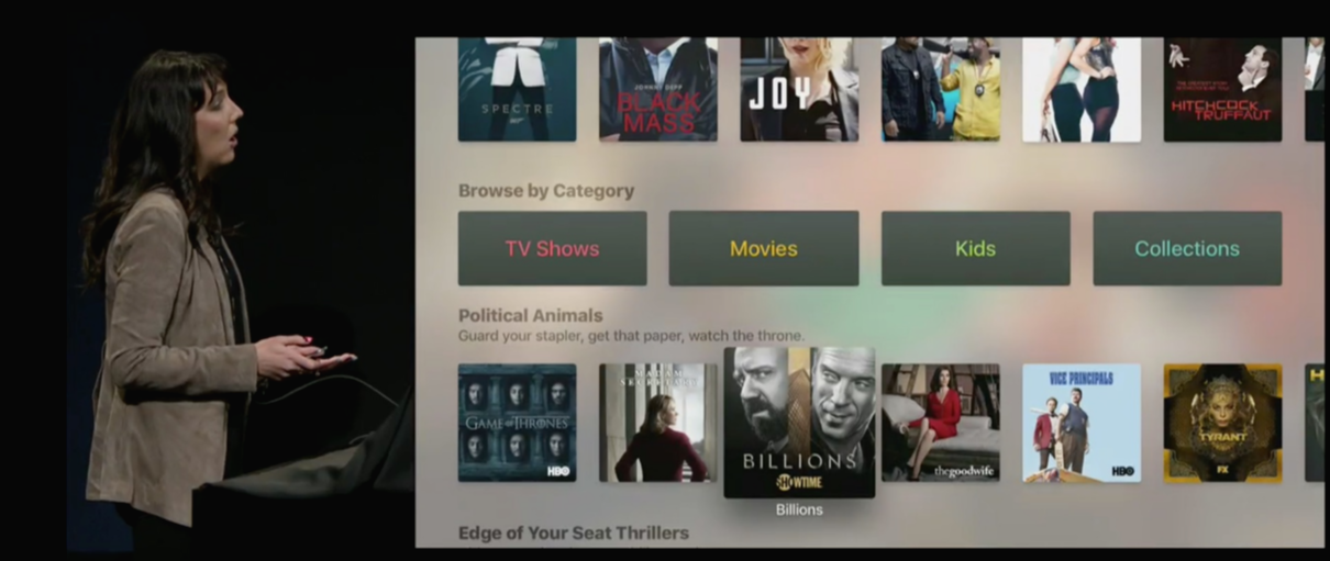 애플은 오늘 새벽 키노트에서 맥북 프로를 발표했지만 개인적으로 관심 있던 부분은 애플 TV의 새로운 TV App이었습니다. 애플 TV의 미디어 포지셔닝은 자기들이 팔고 있는 결제형 동영상 서비스인 iTunes를 비롯 TV Everywhere(Pay TV 가입자들을 위한 App을 통한 라이브/VOD 채널 서비스, CBSN, Watch ESPN, HBO Go, FOX Now 등 스포츠 중심)와 OTT(넷플릭스, HBO, 훌루 등) 등의 동영상 서비스를 즐길 수 있는 기기입니다. 최근 장점으로 미는 것은 시리를 이용한 음성 컨트롤입니다. 그리고 작년 9월 새로운 애플 TV를 발표 시에 팀 쿡은 TV는 앱이다라고 선언을 했었지요.