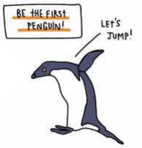 퍼스트 펭귄이 되어야 하지만 성급하게 바로 뛰어들지 말라는 겁니다.