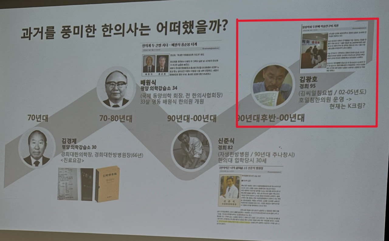 어느 정도냐면 내가 한의대를 다닐 때 수업 시간에 과거를 풍미한 한의사 네 명 중 한 명으로 우리 아버지 이름이 나왔다. (증거 사진도 첨부한다. 아래 빨간 네모가 나의 자랑스러운 아버지이시다.)