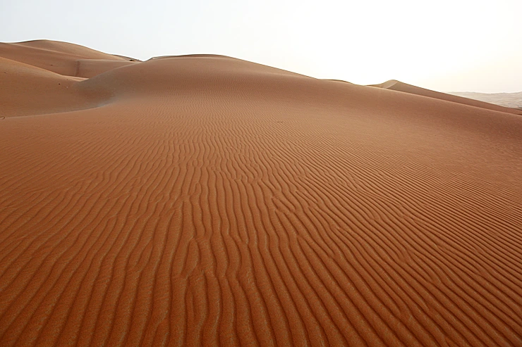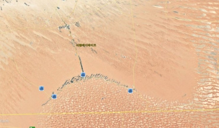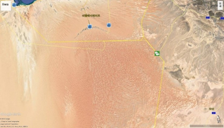 아랍에미리트남쪽의 동그랗게 빗금 친 부분이 리와 사막이다. 좌우 폭은 약 100km, 상하 폭은 약 50km 정도 되는 크기이다. 천지가 사막인 중동에서도 '사막 중의 사막'이라고 불리는, 매우 아름다운 모래 언덕을 뽐내는 곳이다. 아부다비에서 리와를 오고 가는 동안에도 도로 옆은 계속 사막이었지만, 리와 사막은 차원이 좀 다르다. 아래 구글어스 사진을 보면 안다.